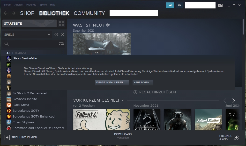 Ich habe heute ganz normal Steam gestartet (hatte Steam eine ganze Weile nicht an) und bekomme nun immer die Meldung dass irgendein Dienst eine Wartung benötigen würde und dafür Admin-Rechte verlangt werden. Also genau wie es in diesem Beitrag steht: https://steamcommunity.com/discussions/forum/24/2270320616974865589/