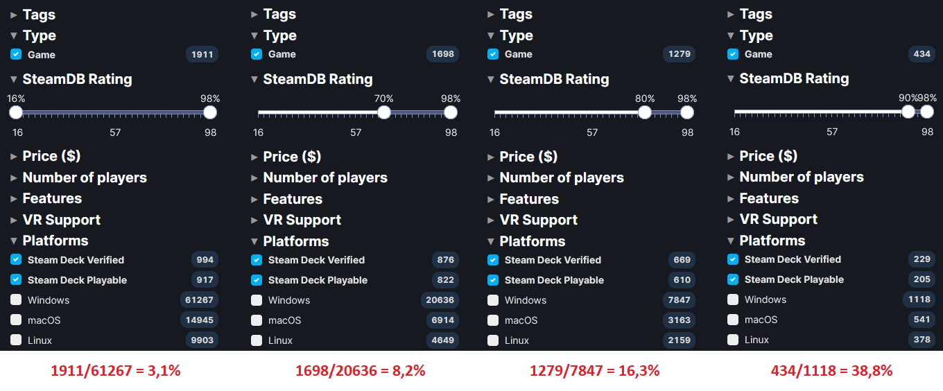 Je stärker man nach SteamDB-Rating filtert, um so höher wird der prozentuale Anteil, z.B. ist über ein Drittel der Titel ab 90%-Wertung bereits "positiv getestet". Bei Titel ab 85%-Wertung ist es immerhin schon jedes fünfte Spiel: