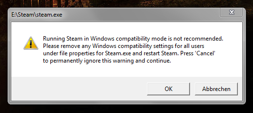Krieg ne komische Meldung das Steam nicht im Kompatibilitätsmodus starten kann, ja ne is klar denn mein Rechner läuft im normalen Modus