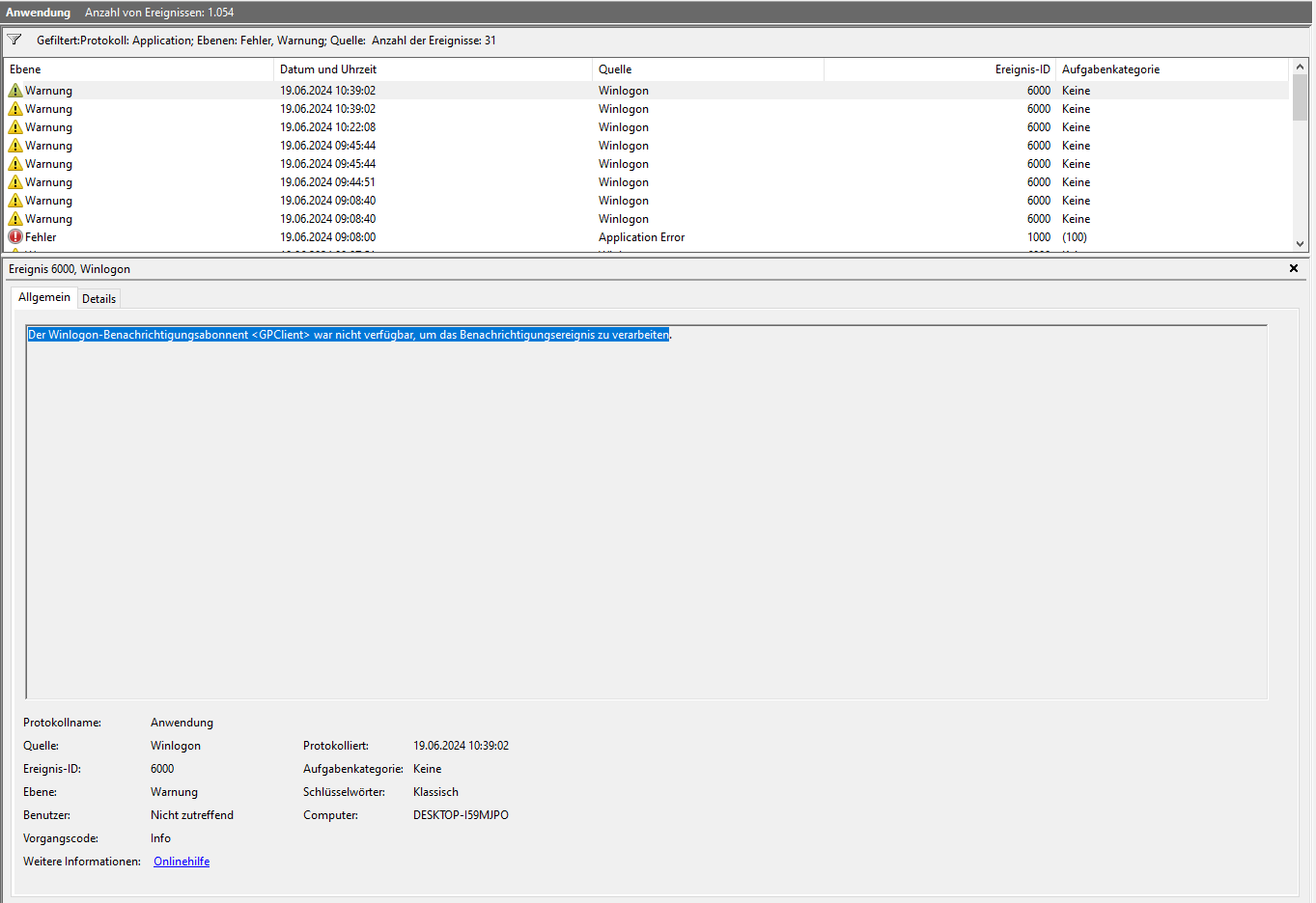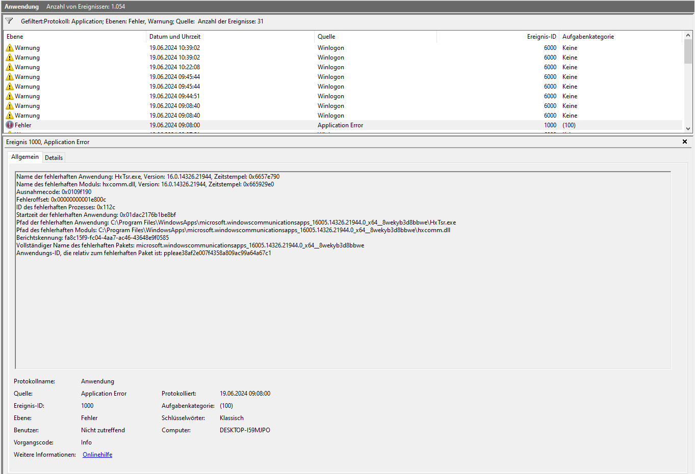 unter Dateien habe ich ein Bild von der Ereignisanzeige angefügt. vielleicht hilft das.