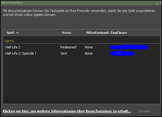 Besucherpass ist das falsche Wort. Das ganze läuft zwar über das Guest-Passes-System, aber die Dinger für Half-Life 2 und Episode One heißen "Gift", während die Besucherpässe ja wirklich "Guest passes" heißen.
