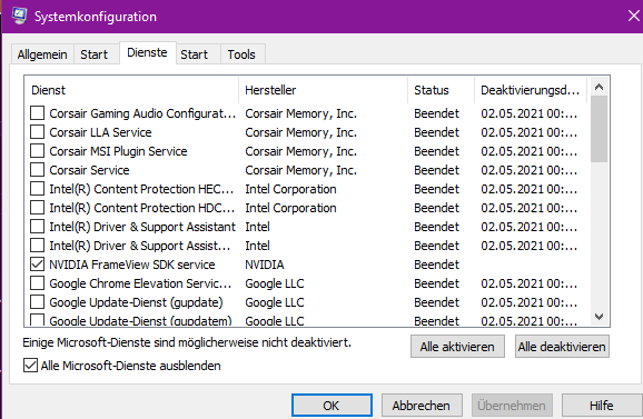 Da habe ich die Hacken raus gemacht, ich hatte erst alle drausen außer natürlich Microsoft Dienste die sind ja wichtig, aber bei manchen Diensten musste ich den Hacken wieder rein machen sonst haben manche Programme probleme gehabt zum Öffnen