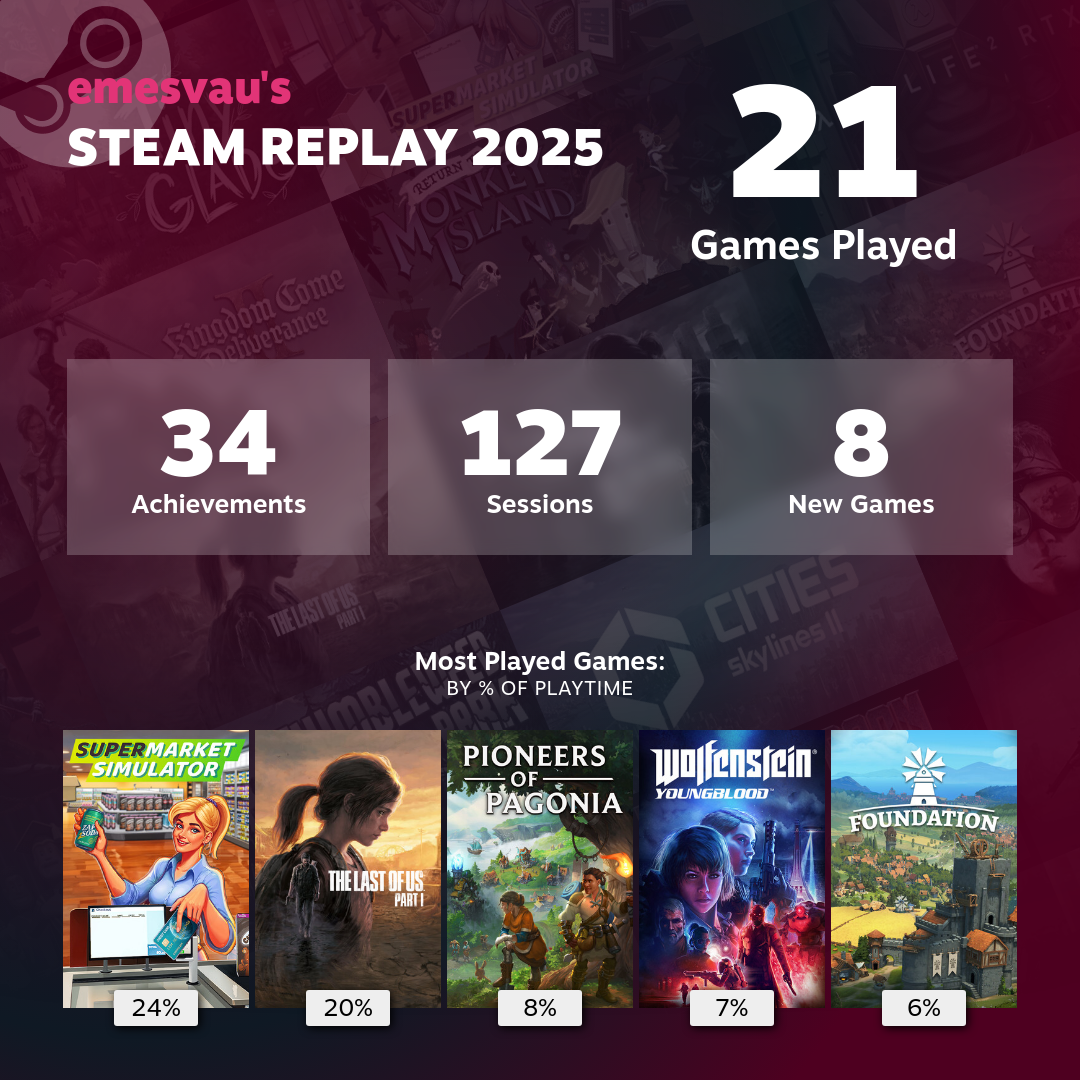 Im Vergleich zu den Vorjahren sieht es bei mir auch mau aus, nur 12 Spiele (PS5), Top Game ist Monster Hunter Wilds mit 90 Stunden, dann war die Luft raus...