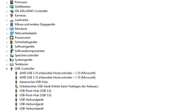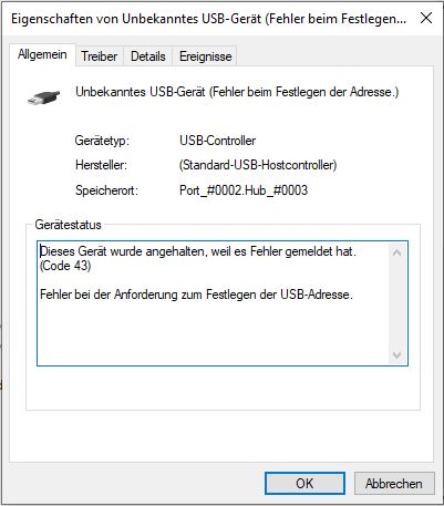 Jedoch beim USB-Controller steht "Unbekanntes USB-Gerät (Fehler beim Festlegen der Adresse.)