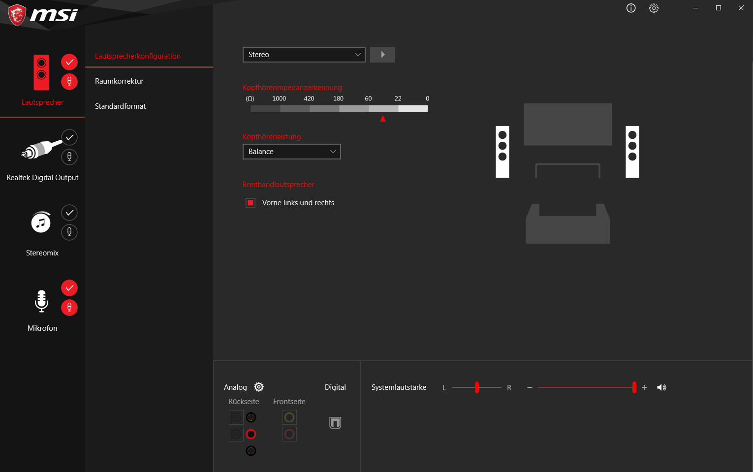 Ich habe das MSI X470 Gaming Pro Carbon Mainboard. Ich habe auch alles eingebaut und es funktioniert alles. Jetzt ist mir aufgefallen wenn ich das Kopfhörer Kabel vom Headset in den Anschluss vom Mainboard Stecke habe ich Sourround Sound. Ich bin aber ehrlich gesagt nicht de Fan vom Sourround Sound... Daher habe ich geschaut ob ich in den Einstellungen was sehe das ich dies auf Stereo umstellen kann. Da habe ich aber bis jetzt leider nichts gefunden. Da ist mit aufgefallen das mein PC Case vorne auch einen Steckplatz für Kopfhörer hat. Nun habe ich da mein Headset angeschlossen und es wahr wieder Stereo Sound.