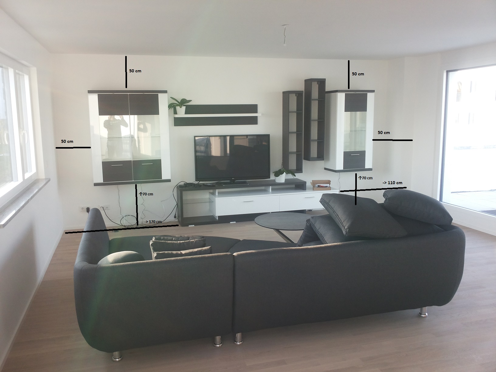 Die Lautsprecher sollen ganz links und ganz rechts stehen, also jeweils in der ca. 50 cm - Lücke zwischen Wand und Hängeschrank.
