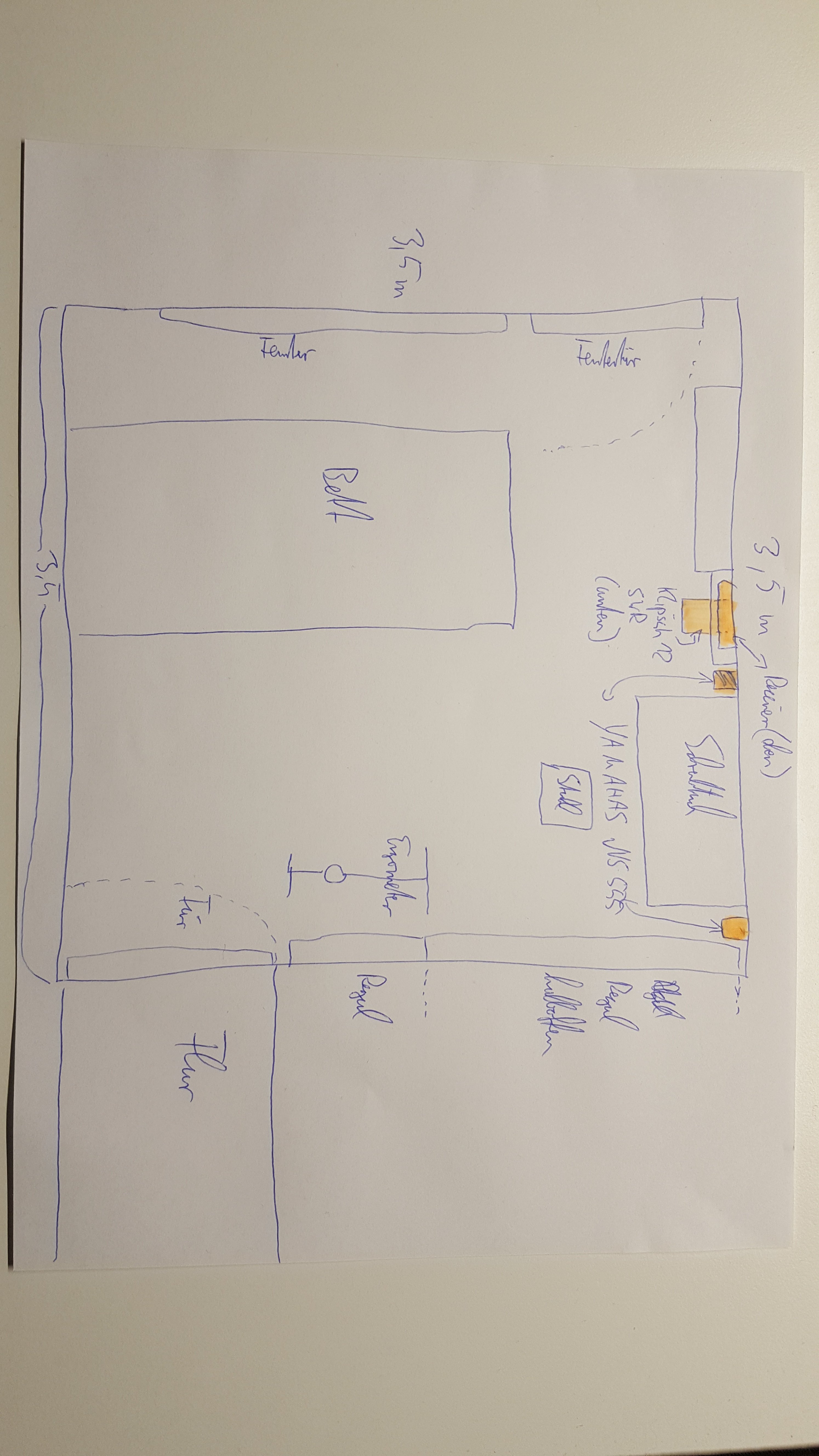 Hallo erstmal und danke für die ausführlichen Anregungen und Gedanken. Ich habe jetzt mal eine kurze Zeichnung vom Zimmer und ein Foto gemacht um es zu veranschaulichen. (Die Unordnung bitte ich zu entschuldigen aber ich habe gerade etwas Platzmangel; Meine Freundin hat zudem auch ein Puzzle auf dem Sub abgelegt x)). Die Geräte sind orange gekennzeichnet.