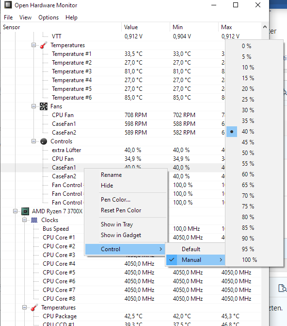 Nun, wenn ich versuche, über BIOS die RPM bzw. Spannung zu steuern, es passiert wirklich nichts. Die beiden Lüfter drehen sich mit maximaler Geschwindigkeit von Anfang an (2400 RPM).