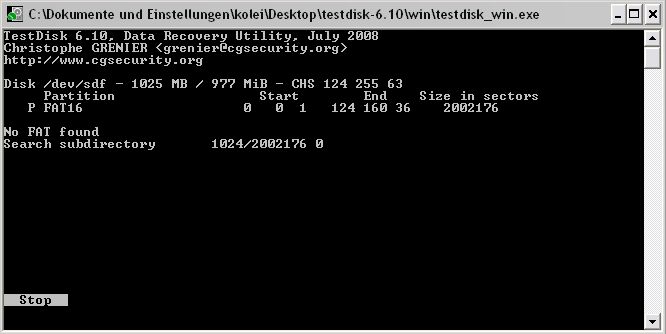 Wenn Testdisk zu lange sucht (mehr als einige Minuten) teile es mit.