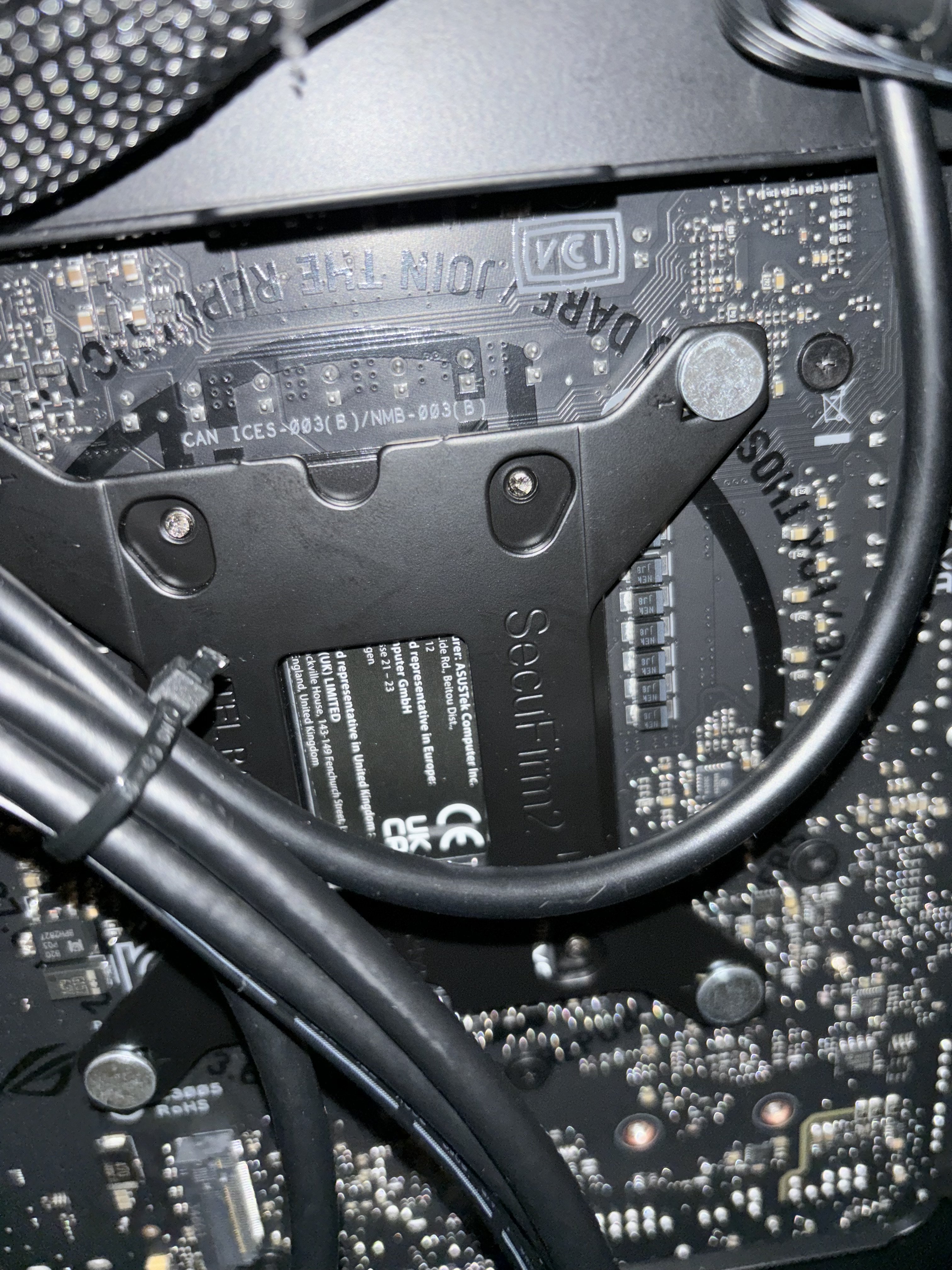 ich hoffe, dass mein Post hier an richtiger Stelle ist. Vor rund zwei Wochen habe ich mein neues Setup zusammengestellt. Hierzu gehört das Asus Rog B760-I mini-ATX Board. Nach zwei Wochen in Betrieb ist mir jetzt erst aufgefallen, dass sich auf der Backplate ein Herstellersticker befindet (vgl. Foto). Ich bin fest der Ansicht, dass der Sticker sich unterhalb der "Hersteller-Backplate (?)" befindet. Hier wurde dann der Rahmen für den Noctua NH-U12S-Redux installiert wird.