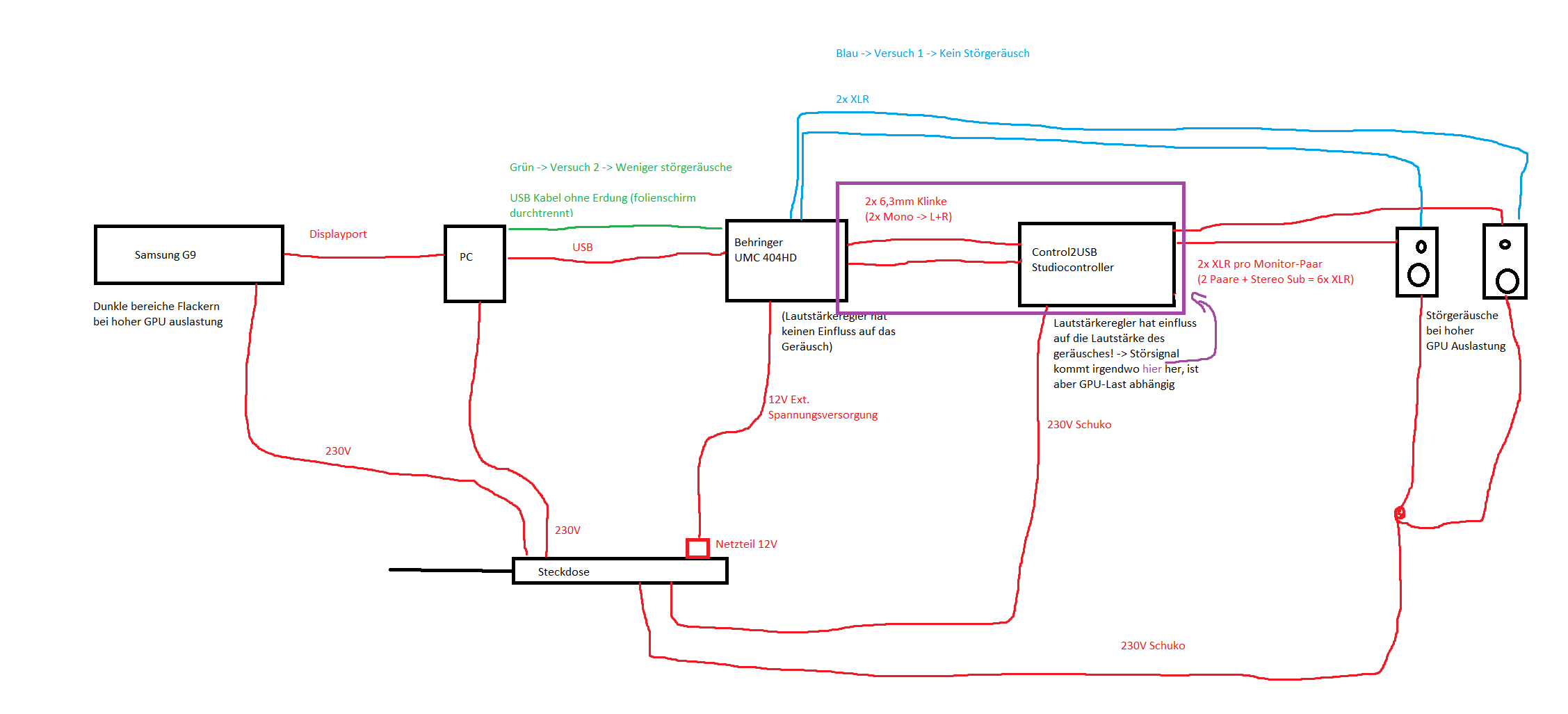 Wenn ich das Control2USB gerät überspringe, und direkt von meinem audio Interface zu den Lautsprechern gehe, verschwindet das geräusch (weglassen des Controllers ist keine Option, außerdem besteht ja parallel das Problem mit dem Bildschirm)