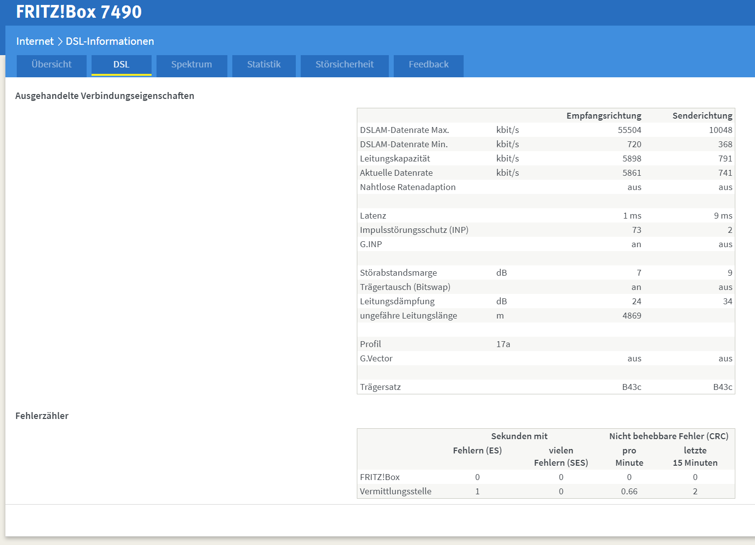 Bis gestern seit über 6 Tagen (Update auf FB 7.11) stabile Verbindung am zugesicherten Maximum des 50 Mbit Vertrages. Seit eben diese Leitungswerte (Bild) und ein absolut gestauchtes Spectrum.