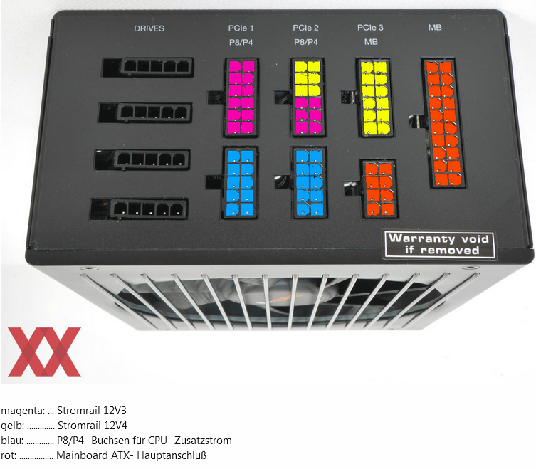 Hey allesamt und vor allem hey @Motorrad , ich habe mir extra für diesen Beitrag hier ein Benutzerkonto erstellt. Ich habe das 1200w Platinum Straight Power 11 (neu gekauft) und will mit einer Referenz 7900XTX (2x 8Pin) mit Strom zuverlässig versorgen. Bei diesen Netzteil habe ich insgesamt drei von diesen Doppelsteckern für PCIe zur verfügung. Da ich im Netzteil beide rails, also 12v3 und 12v4 nutzen will bzw. soll, muss ich ja in PCIe1 und PCIe3 jeweils ein Kabel stecken. Wenn ja bei diesen Doppelstecker ja nur sechs der zwölf Pins genutzt werden wenn ich einen der beiden "doppelsteckerleitungen" in den ersten 8Pin Anschluss und das ebenso mit dem doppelstecker der anderen rail anschließe, hab ich es ja sozusagen richtig angeschlossen, oder? theoretisch laut deiner "Skizze" (die für mich absolut logisch klingt) kann ich weil ich ja nur 2x8 Pin brauche es mit einem einzigen doppelstecker in PCIe2 anschließen, da trotzdem 12v3 und 12v4 einzeln versorgt werden. zwar nicht so gewollt wie nach Anleitung, aber trotzdem vom sinn her ist es doch gleich oder? Ich hoffe man kann verstehen wie ich das meine. Ansonsten nutze ich es wie anfangs beschreiben an PCIe 1 und 3 jeweils mit einem Doppelstecker, bei dem pro stecker nur einer der beiden leitungen für die Summe der 2x8 Pin dann den Strom hergeben. welchen der beiden 8 Pin pro Doppelstecker sind doch eigentlich egal, oder? Dazu finde ich auch nichts im Netz.Motorrad schrieb:Wie sieht denn das Kabel genau aus? Wenn es original von Be Quiet ist, dann ist es doch bestimmt ein Doppelkabel und kein Y- Kabel!