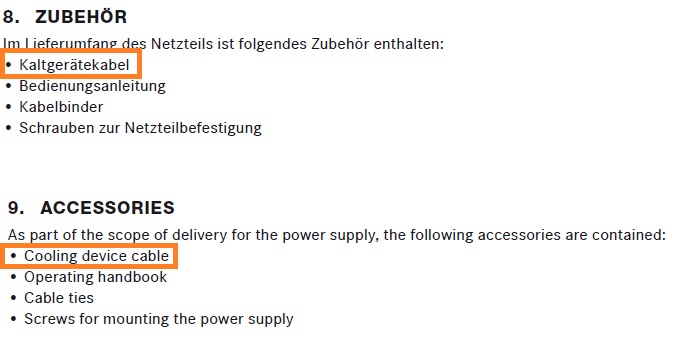 Wenn man es auf Deutsch liest, ist alles super, aber fuer jemanden, der auf die englische Anleitung angewiesen ist, kann der Verdacht aufkommen, dass der Lieferumfang nicht vollstaendig ist, da man vergeblich nach einem Luefterkabel, etc. sucht. "Power cable" waere wohl angemessener