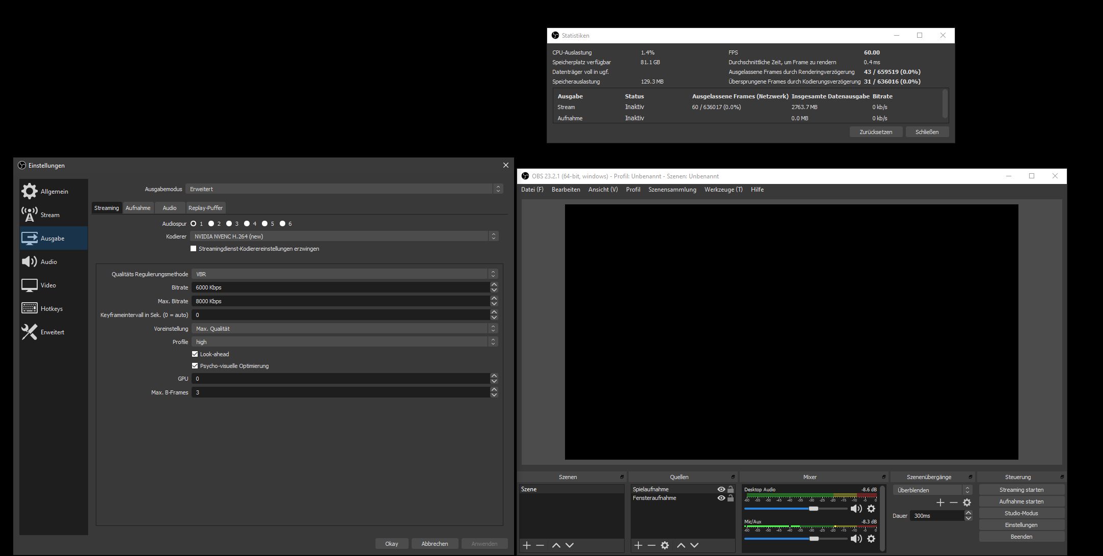 Ersteres kommt häufig dann zum Tragen, wenn eine Software - also ein Spiel - die GPU nahezu vollständig belastet. OBS muss dann für seine paar Prozent GPU-Power kämpfen. Das führt dann dazu, dass OBS seine Scene nicht schnell genug erstellen konnte. Bei den skipped encoder frames kam der encoder nicht hinterher und bei den network frames wurden die Daten entweder nicht schnell genug gesendet oder erhalten.