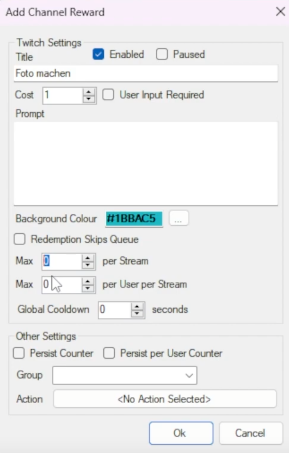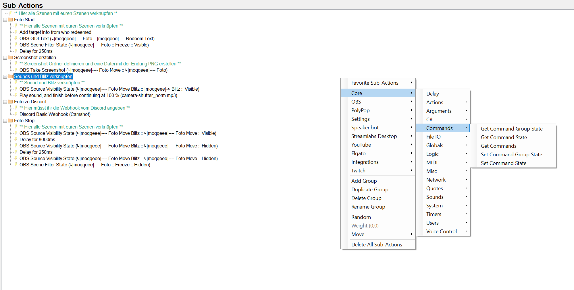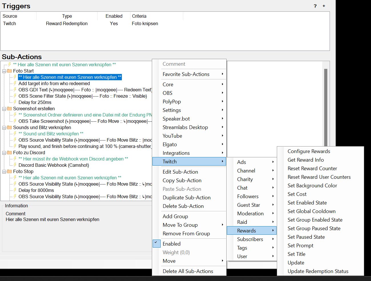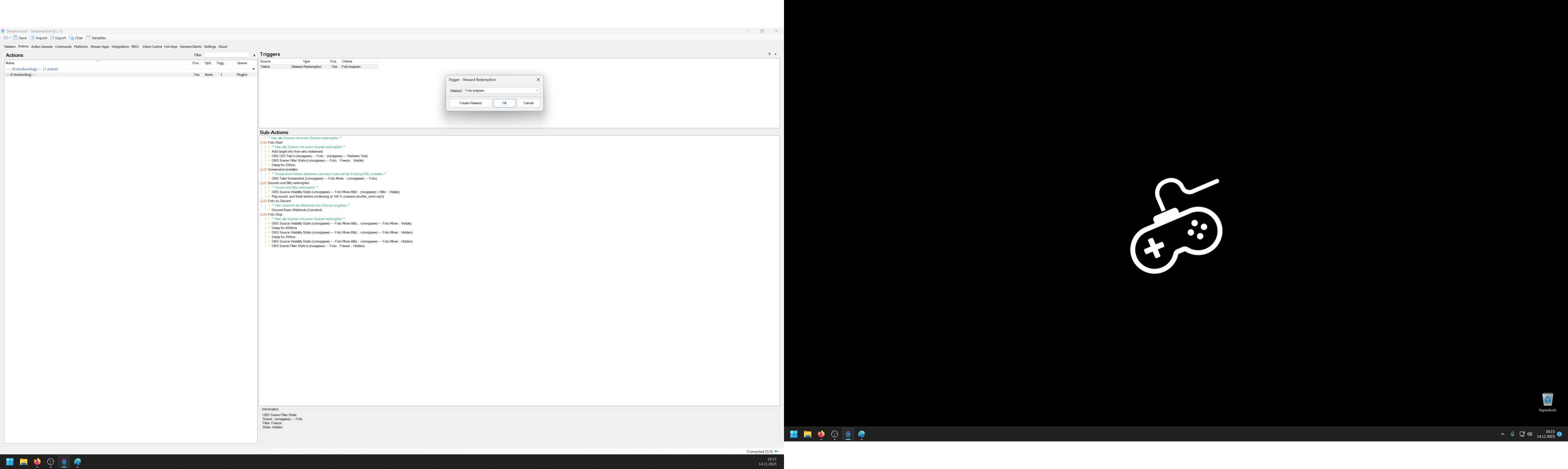 Ich will ein Fotoshooting.. naja nicht ganz, ich will das meine Community durch erlös der Kanalpunkte ein Foto von mir schießen kann. Das Problem was ich hier habe ist, dass ich das ganze über Streamer.bot v.0.2.1 einstellen möchte.