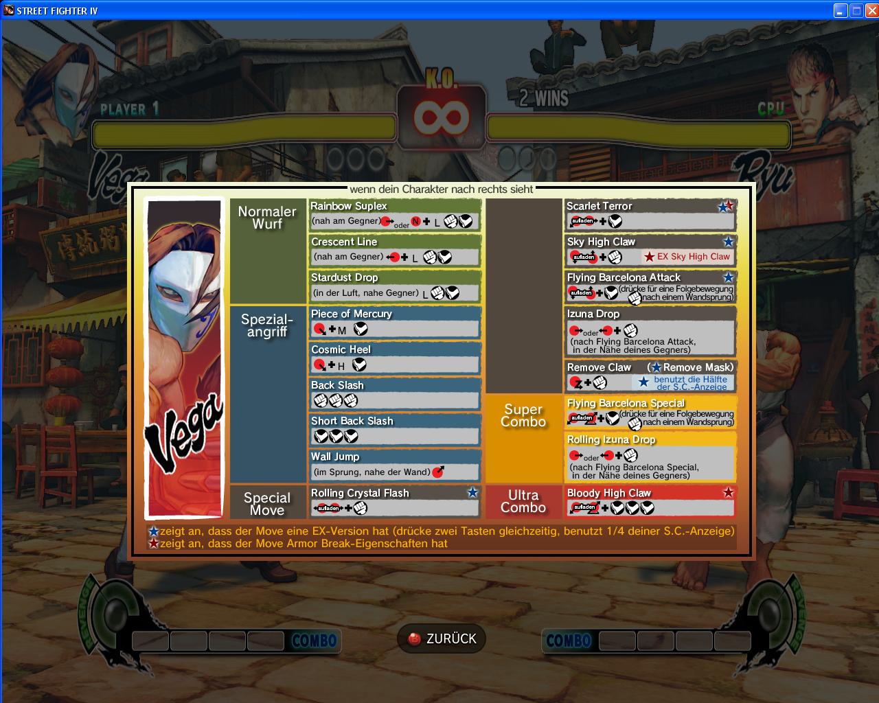 Um die Supermoves und Ultimates zu ueben empfehle ich dir nen anderen Charakter als Vega, denn Vega is eher was fuer Fortgeschrittene, sprich er hat komplizierte Combos und Moves, ist blitzschnell aber macht wenig Schaden, des Weiteren musst du aufpassen das du deine Klaue und Maske nicht verlierst da du sonst weniger Schaden austeilst bzw. mehr Schaden einsteckst.