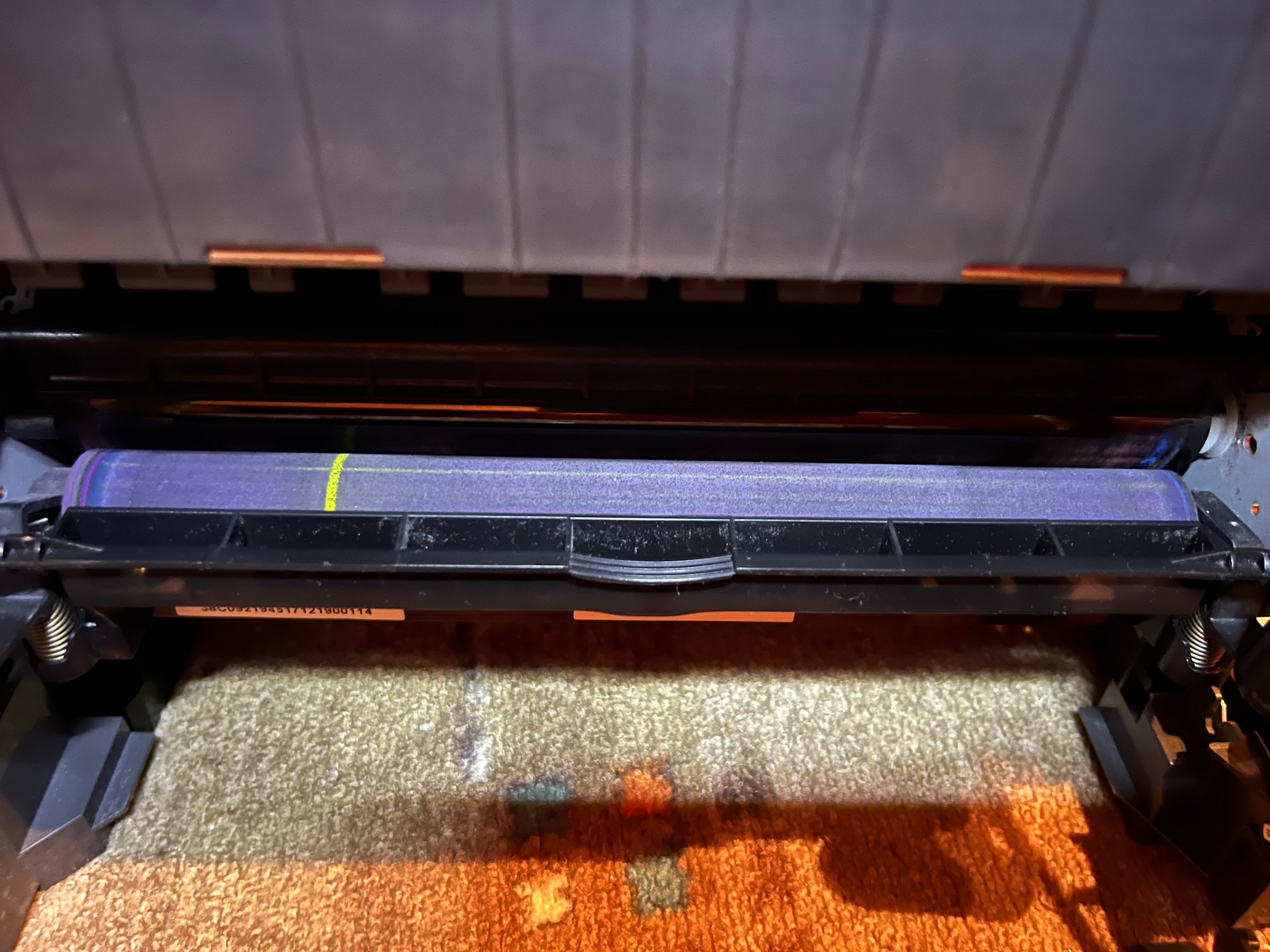 Ich habe den Drucker geöffnet und an der Frontseite eine Rolle gefunden, die einen gelben Streifen hat, (siehe Foto) genau an der Stelle wo auf dem Papier dann später die gelben Punkte sind. Ich habe die Rolle gereinigt, der Streifen auf der Rolle war dann weg. Dann eine Seite gedruckt und schwupps, war der Streifen wieder da und auf dem Papier auch wieder die Punkte. :-(