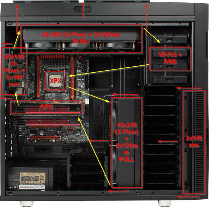 Kommendes Jahr moechte ich die GPU ersetzen und aufgrund der ueberragenden Kuehlleistung soll der Kreislauf erweitert werden. Aufgrund des Big Towers sowie der vorhandenen Mount-Vorrichtung neben dem HDD-Rack schwebt mir folgendes vor: