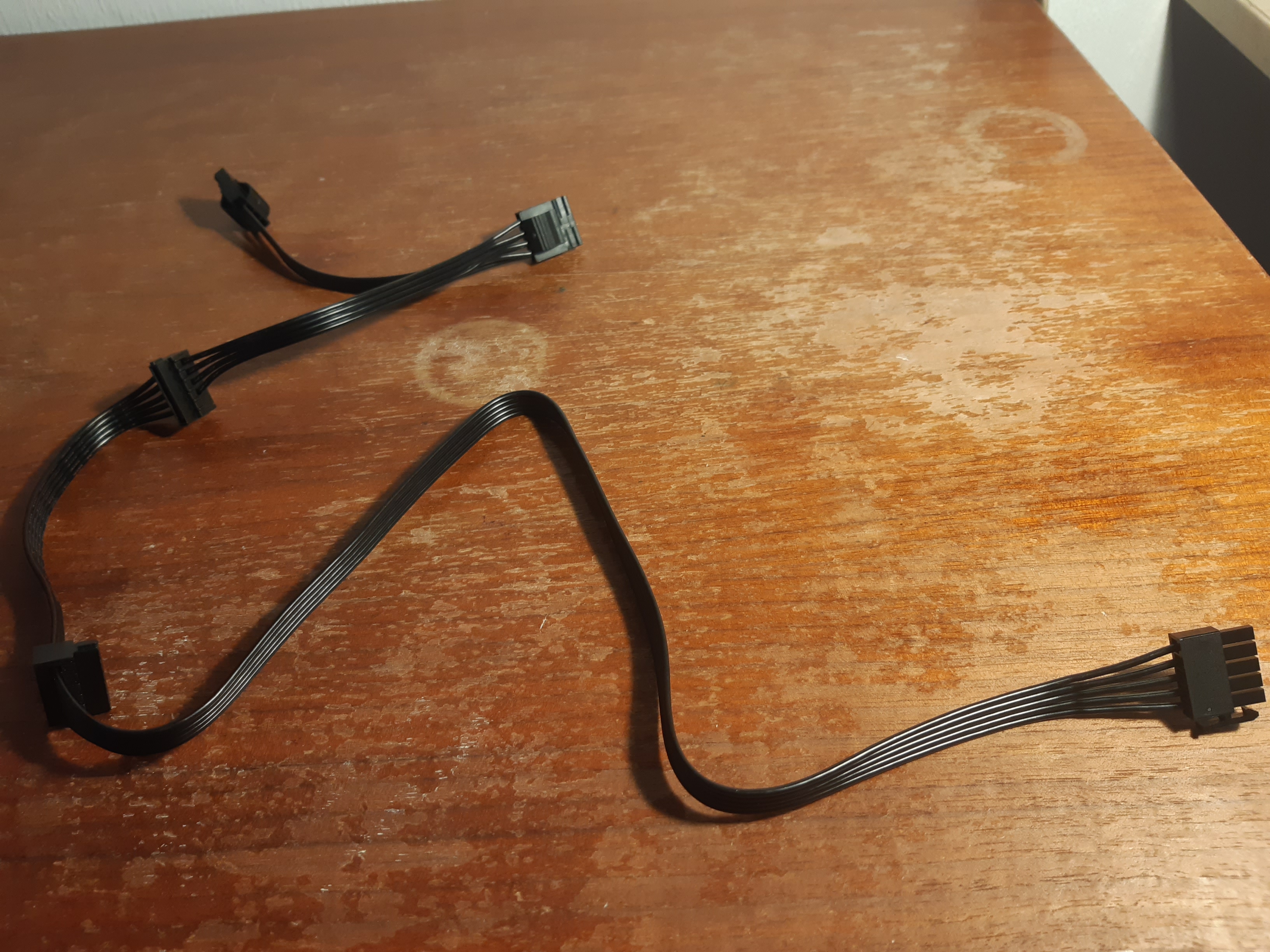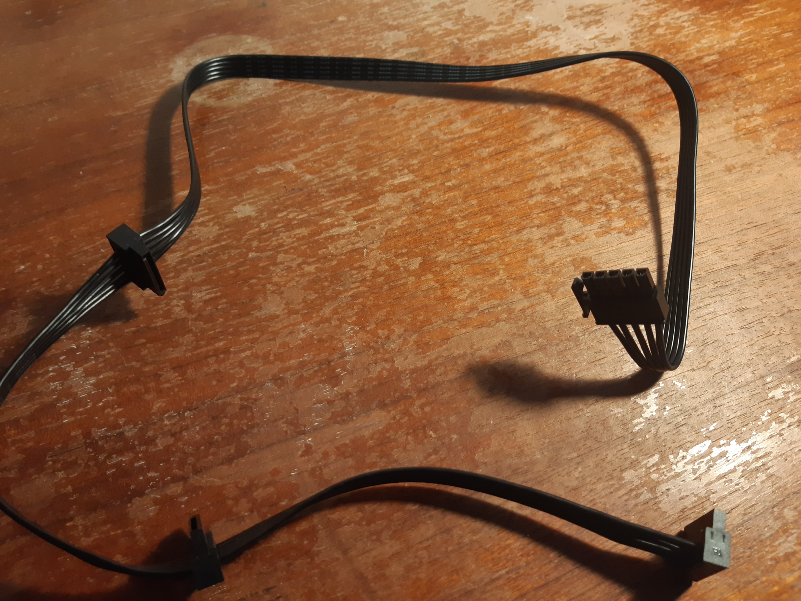 Meine Idee wäre jetzt das alles mit Kabel 1 zu lösen, das beim Netzteil dabei war. Das hat einmal einen Stecker, der in das Netzteil passt und ansonsten 3 Adapter, in die mein Satakabel vom Gehäuse passt. ( Die zwei nicht genutzten Adapter würde ich halt nicht belegen, sprich die würden lose am Kabel hängen).