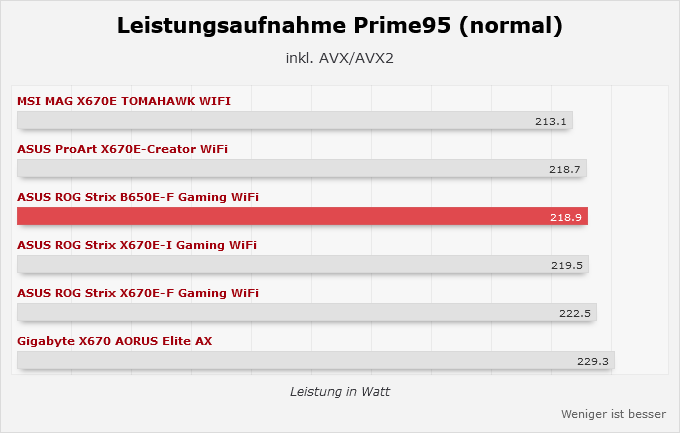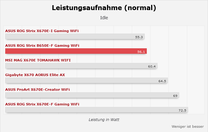 Nehmen wir dann noch das Mainboard zur Brust, so haben wir hier diverse Einzelchips (Sound, LAN, VRMs), den Chipsatz selbst und kommen im Idle auf einen Stromverbrauch von 5-10, im Lastszenario auf 50-100 Watt (je nach CPU-Auslastung, da hier vieles über die VRMs in Wärme verpufft).