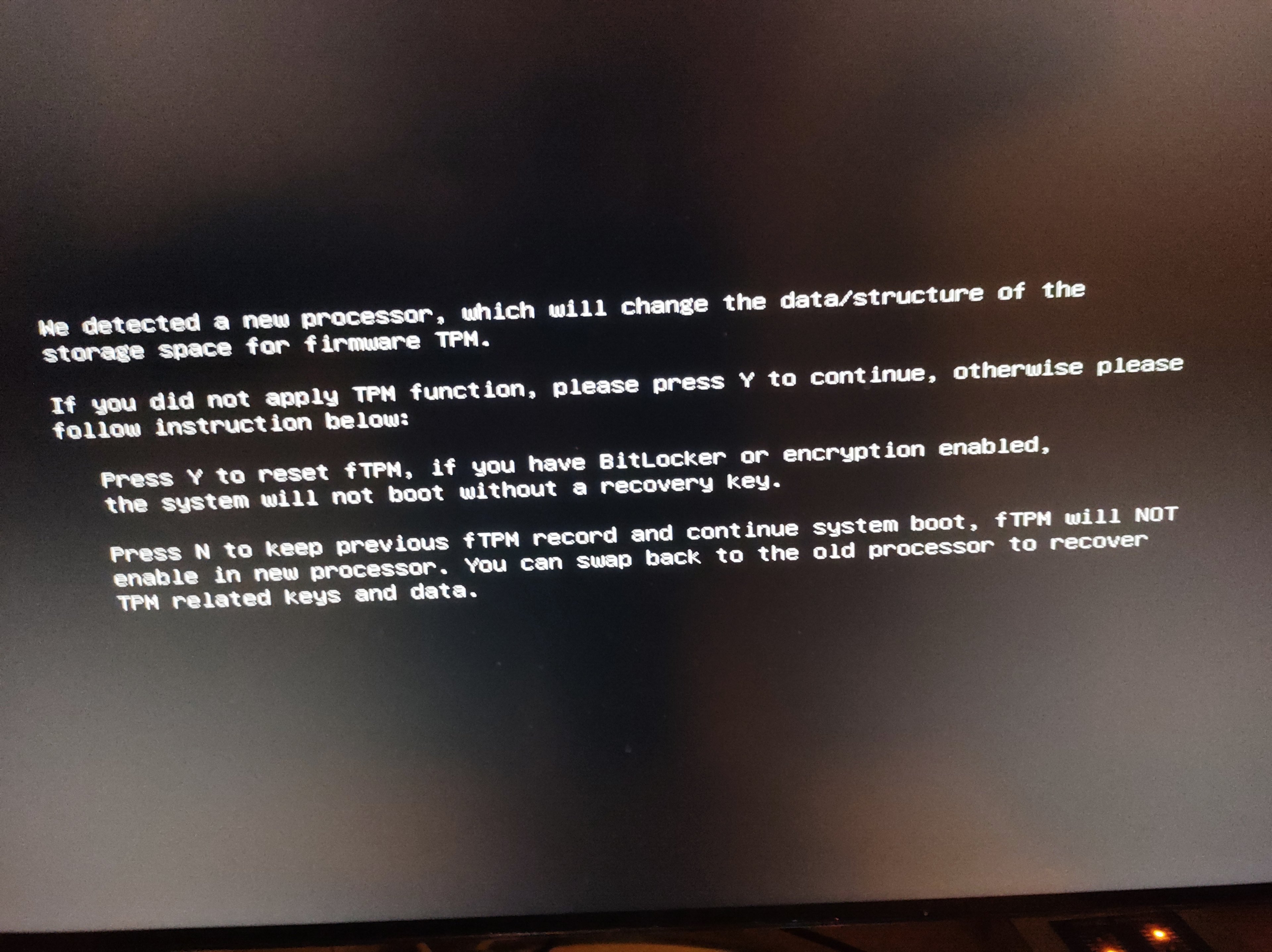 Wenn ja alte CPU einbauen, (Bitlocker) Veschlüsselung entfernen, neue CPU installieren und die Meldung mit "Y" bestätigen. Danach neue Verschlüsselung durchführen.