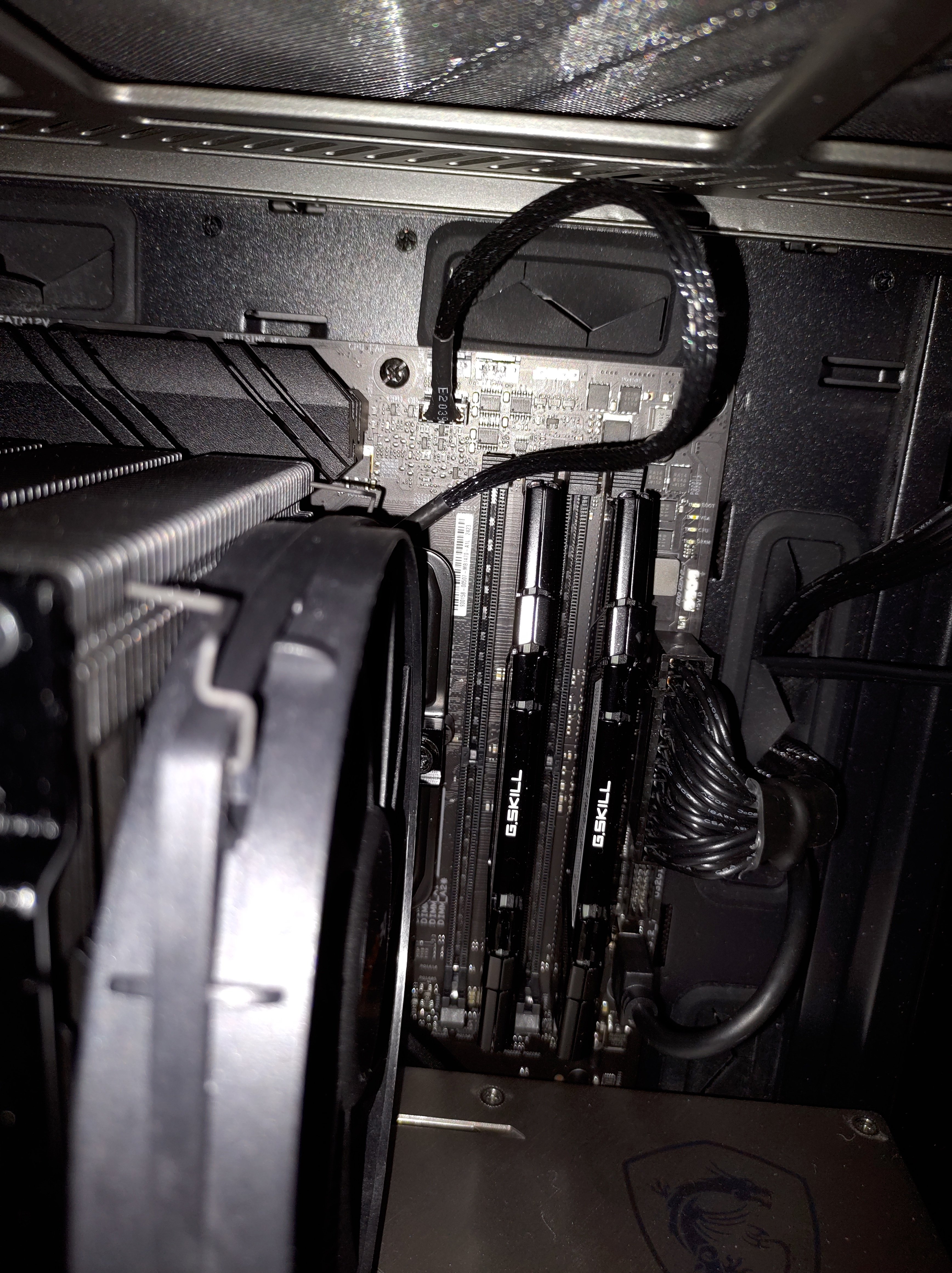 Ich konnte einen der vorderen Lüfter anschließen. Für den anderen, finde ich das Kabel nicht mehr. Vermutlich, ist es in den Kabelschacht gefallen.