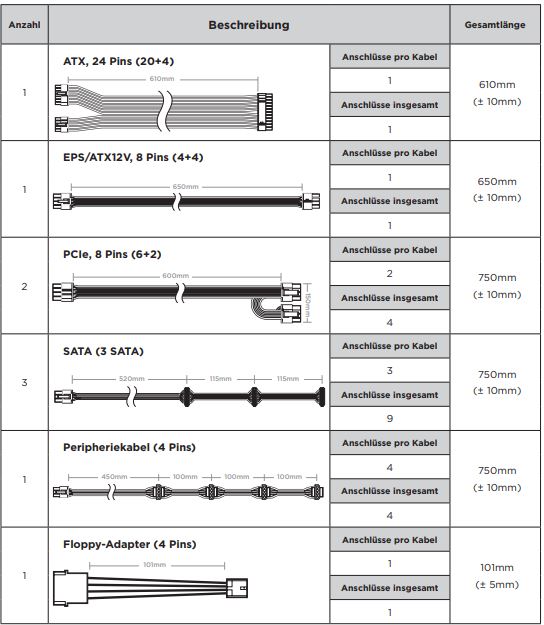 Mitgeliefert wurden zwei Anschlüsse PCIe, diese verfügen aber pro Kabel über zwei 4PCIe