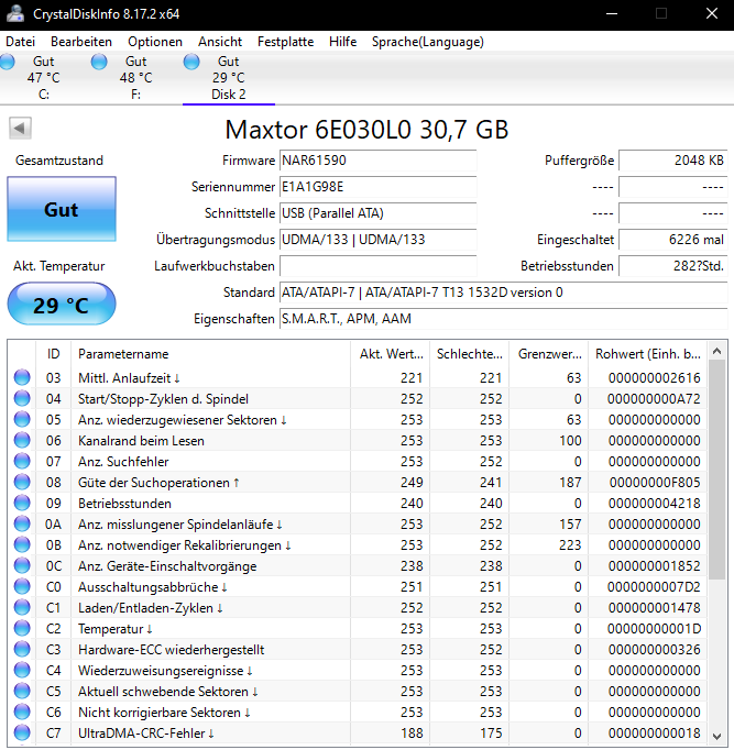 Schaut man sich die SMART-Werte meiner Maxtor an, sieht man auch die Unterschiede in der Schreiblast.