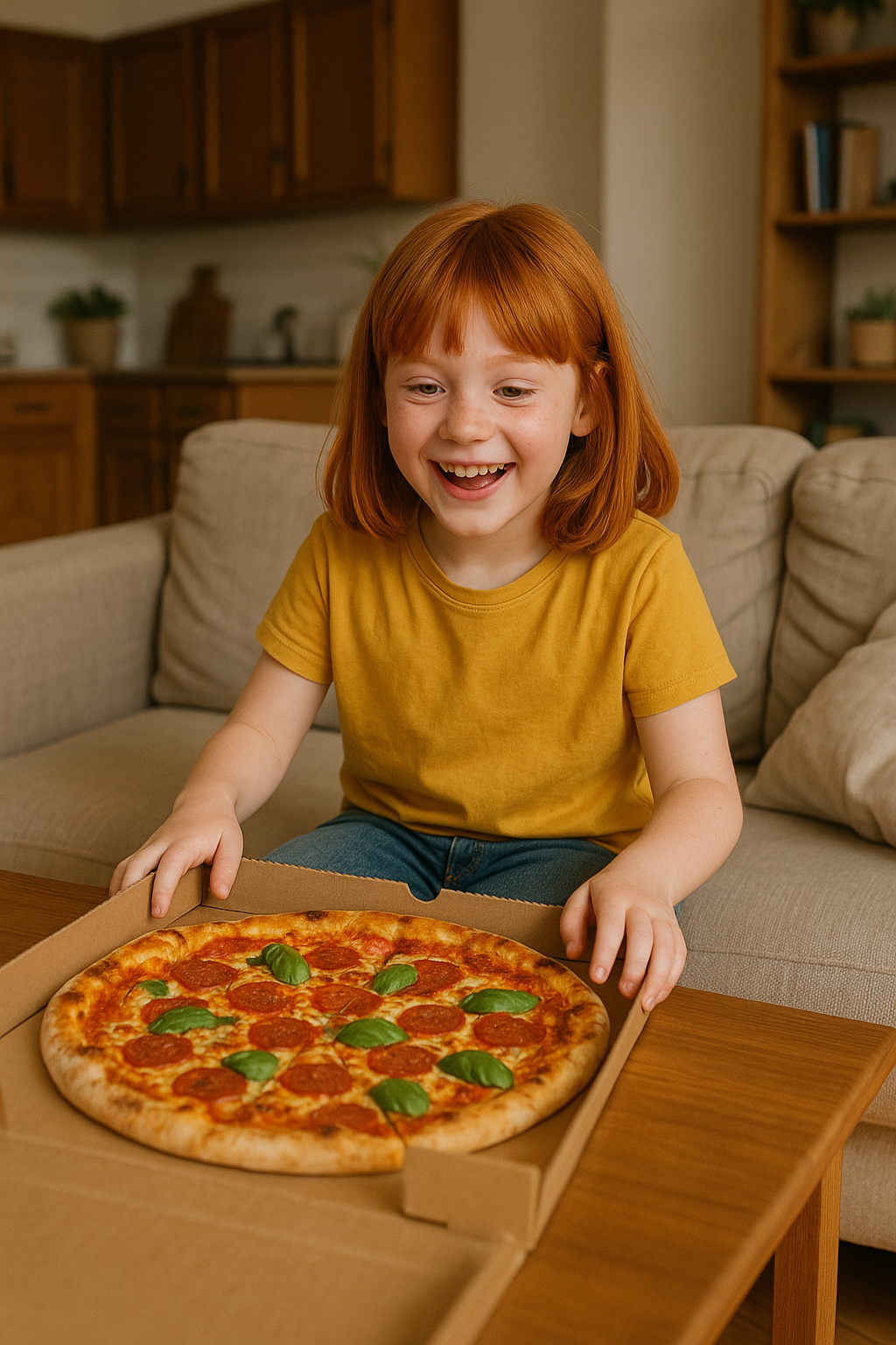 Ein kleines Mädchen mit orangenen schulterlangen Haaren. Sie sitzt auf einer Wohngemeinschaft im Wohnzimmer. Auf dem Wohnzimmertisch liegt eine große gelieferte Pizza. Das Mädchen freut sich.