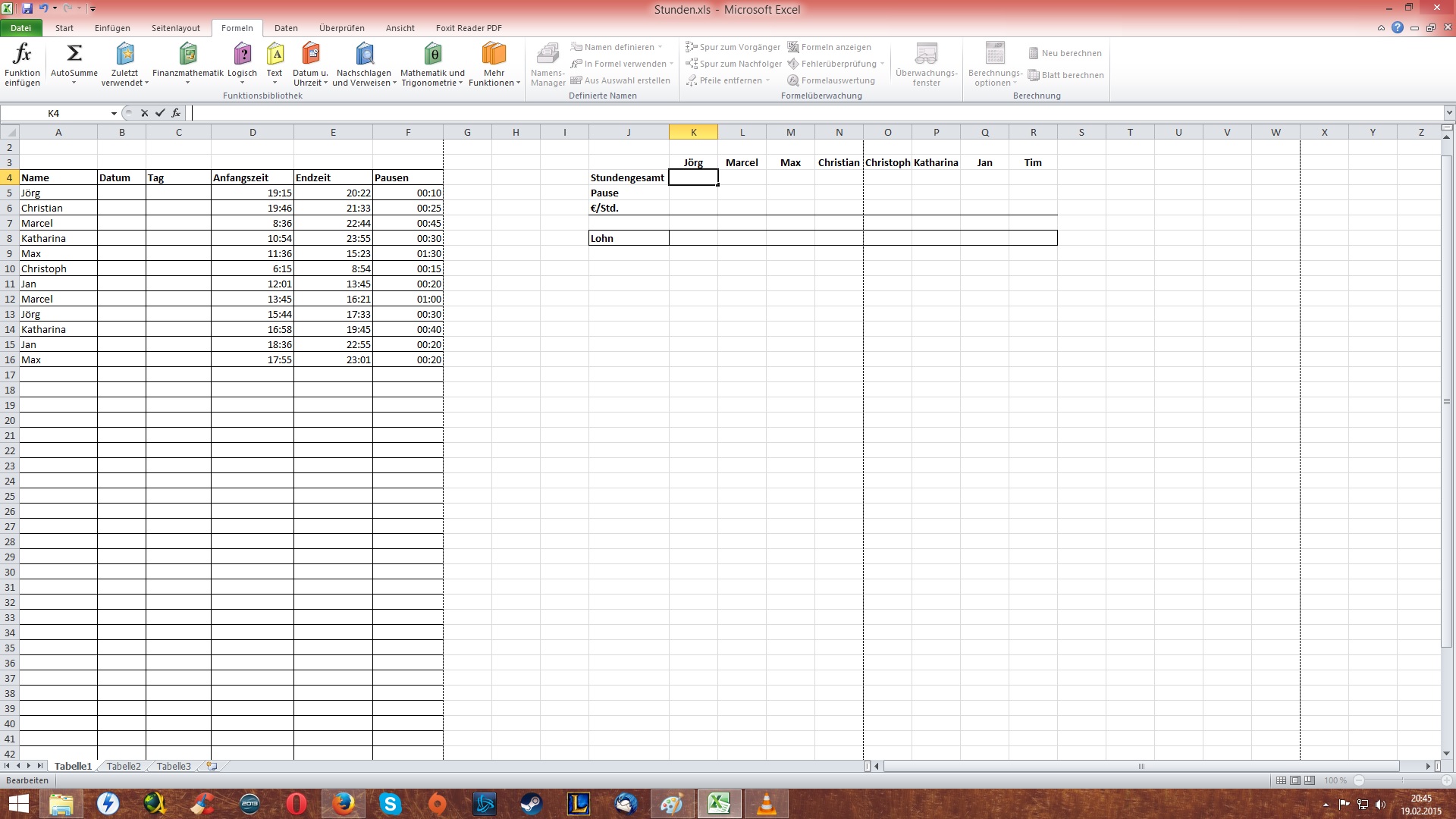 habe ein Problem. Ich möchte jetzt den Wert Jörg in der Spalte A suchen. nun soll überall, wo er einen Wert findet, die Anfangszeit von der Endzeit abrechnen. Hatte es mit Wenn probiert, klappte aber überhaupt nicht. Kann mir da einer helfen? Dies soll für alle weiteren Personen auch passieren.
