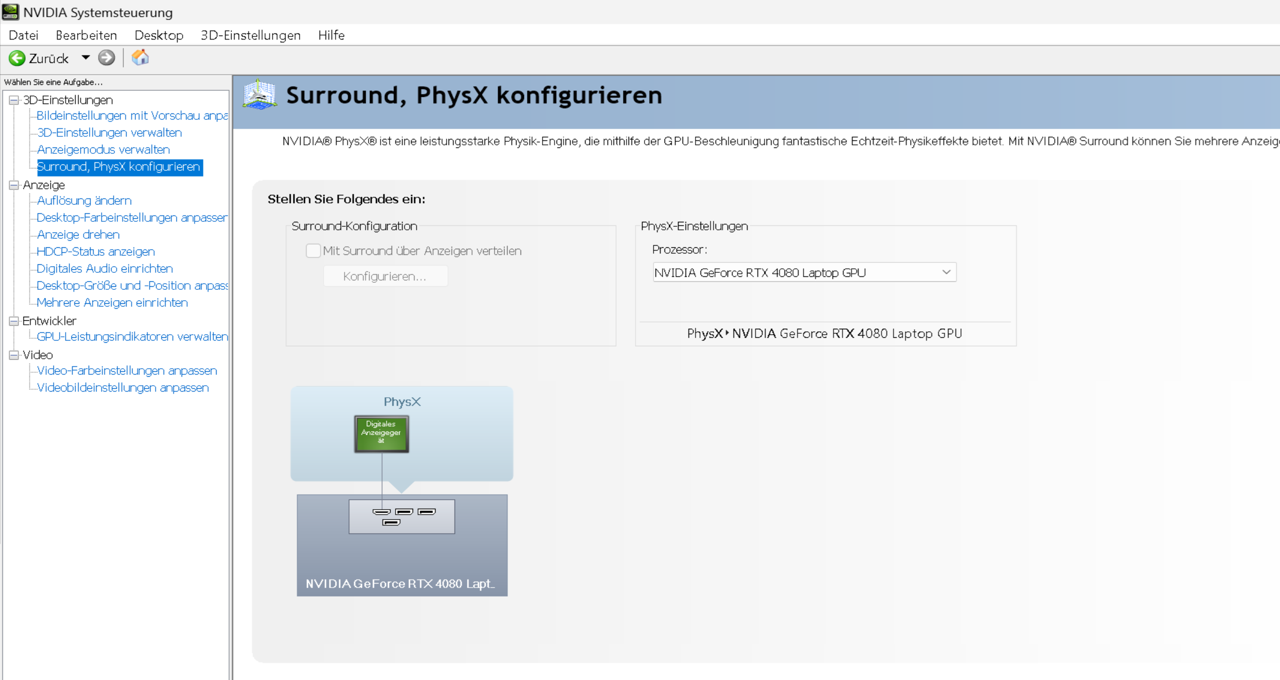 Bei ca. 40% CPU, RAM & GPU Auslastung fangen Spiele an zu "stuttern", sprich die FPS brechen für einen Bruchteil einer Sekunde ein bzw. fühlt es sich so an, als würde ich auf einer hochskalierten niedrigen Auflösung spielen und mein Cursor zwischen den Pixeln springt. Ich habe den Eindruck, dass mein Laptop zwischen onboard GPU und der NVIDIA GPU schaltet, weshalb es dann zu diesen Problemen kommt. Wenn ich die onboard GPU deaktiviere, dann kann ich keine Spiele starten während ich den zweiten "Billo-Bildschirm" angeschlossen habe. Die Spiele ruckeln dann extrem und hängen sich schon im Ladebildschirm auf. Das Problem habe ich jetzt nicht, wenn ich die onboard GPU aktiviert habe, sondern nur wenn diese aktiviert ist und der zweite Bildschirm angeschlossen ist. Mein Main Bildschirm (der vom laptop) hat 244Hz, der zweite Bildschirm jedoch nur 60Hz. Ich habe bei den Anzeigeeinstellungen "Diese Anzeige erweitern" ausgewählt. Vielleicht hat es damit etwas zu tun, sprich mit den unterschiedlichen Hz der Bildschirme? Gibt es einen Weg beide Bildschirme anzuschließen und alles über meine NVIDIA GPU laufen zu lassen, ohne diese Probleme? Gibt es eine Möglichkeit den zweiten Bildschirm als eigenen Bildschirm zu definieren und nicht als bloße Erweiterung des 1. Screens? Sorry, bin jedoch blutiger Laie 😅
