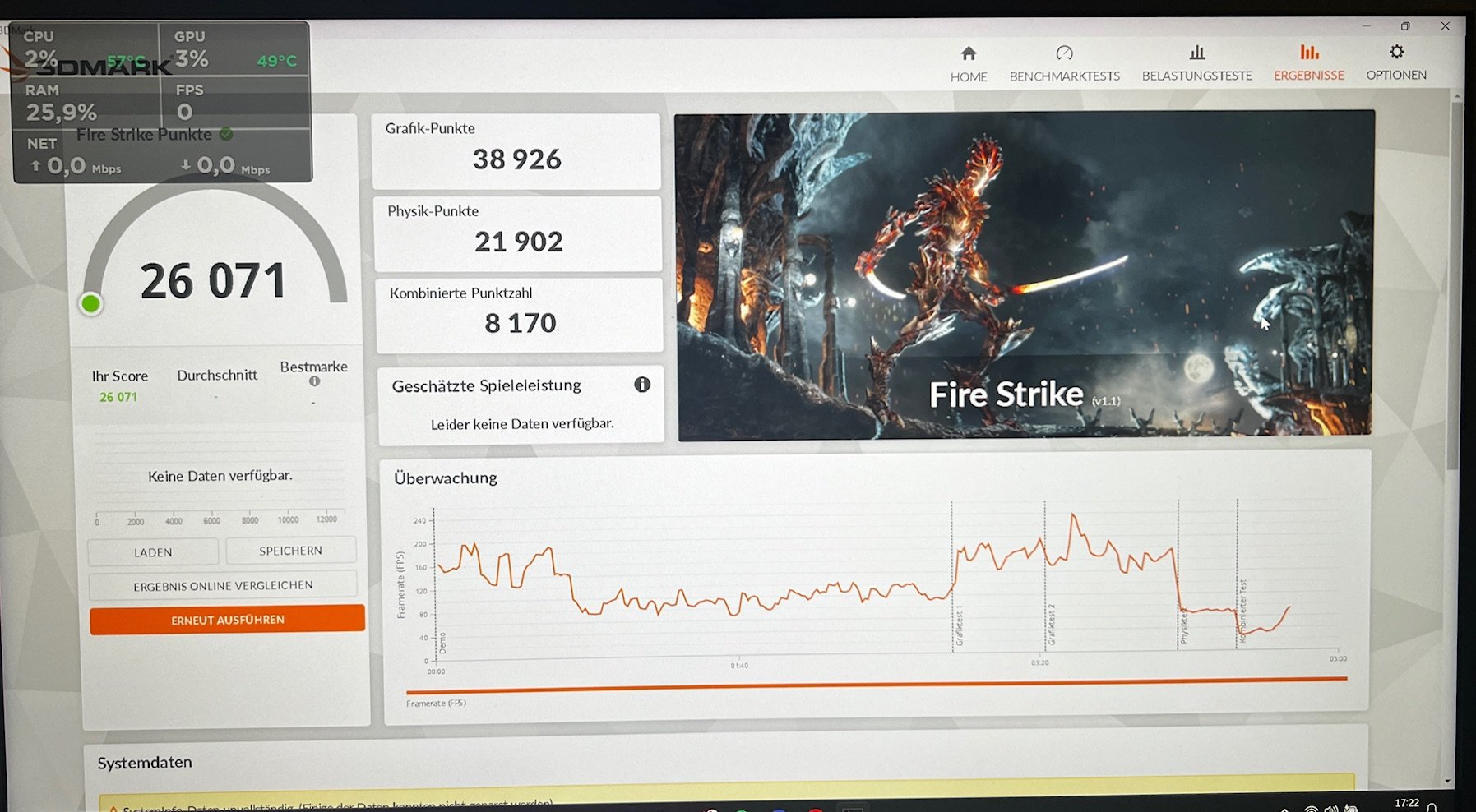 Leistung mit angeschlossenen/gekappten 2. Bildschirm verglichen. Intel GPU deaktiviert, damit alles über NVIDIA läuft.