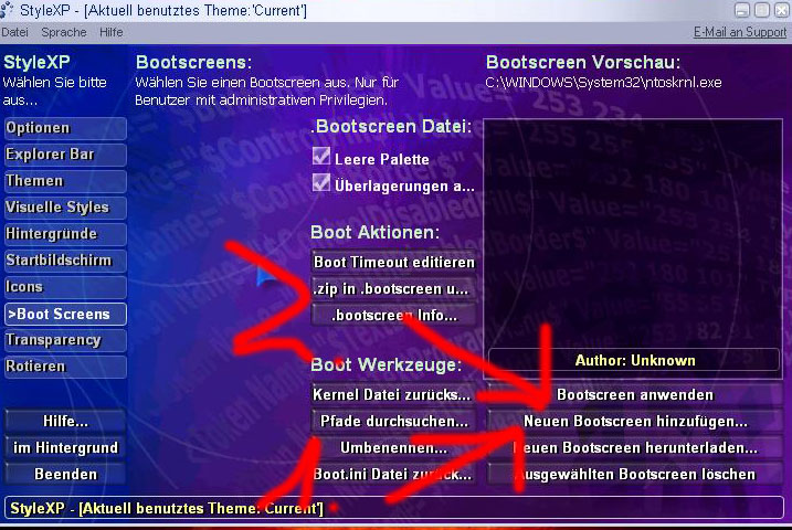Die Datei die du für StyleXP herunterladen kannst sollte eine gepackte Datei sein. Wenn du die hast gehts du zb. zu Boot Screens und klickst aus Boot Screen hinzufügen. Dort gibts du die Datein an. Dann noch auf anwenden und schon sollte es gehen.