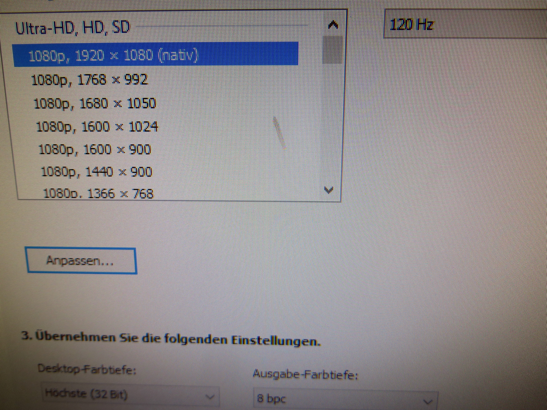 Zwischen 60hz und 120hz (per nVidia Systemsteuerung) merke ich nicht wirklich viel, nur beim Umschalten ein kurzes Flimmern in der linken oberen Ecke.