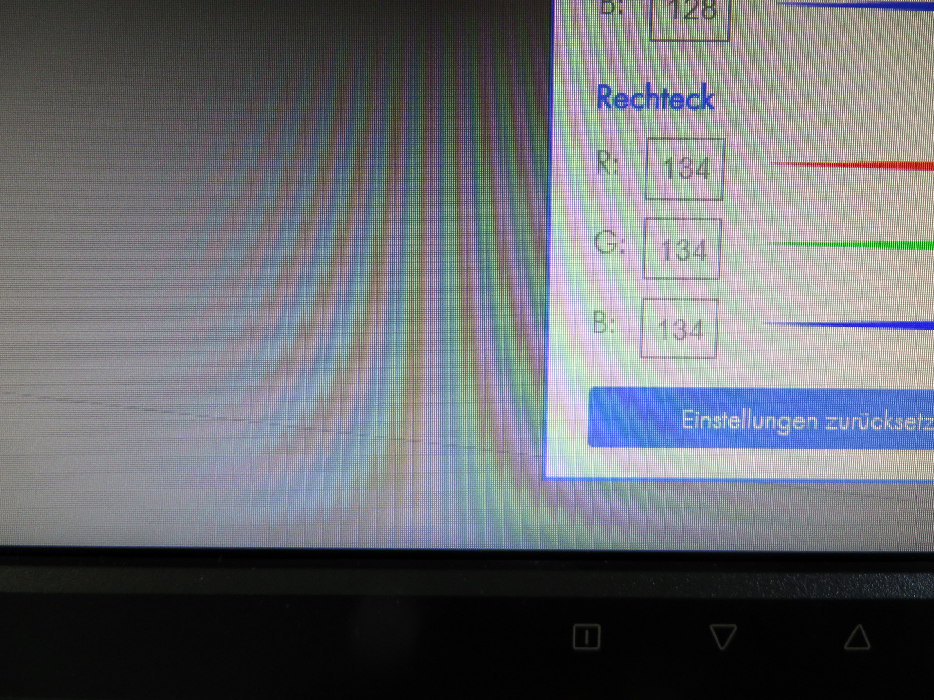 Hab per Kamera (CANON SX280HS (ebenfalls die Fotos oben)) auch ein kleines Video aufgenommen und beim leicht schräg-halten gibt der Monitor die Seiten mit einem deutlichen gelben Bereich wieder, bevor es nach aussen hin dann schwarz wird (ab 00:15), zuvor sieht man einen Fliegengitter-Effekt auf dem Weiss, wie ich finde: