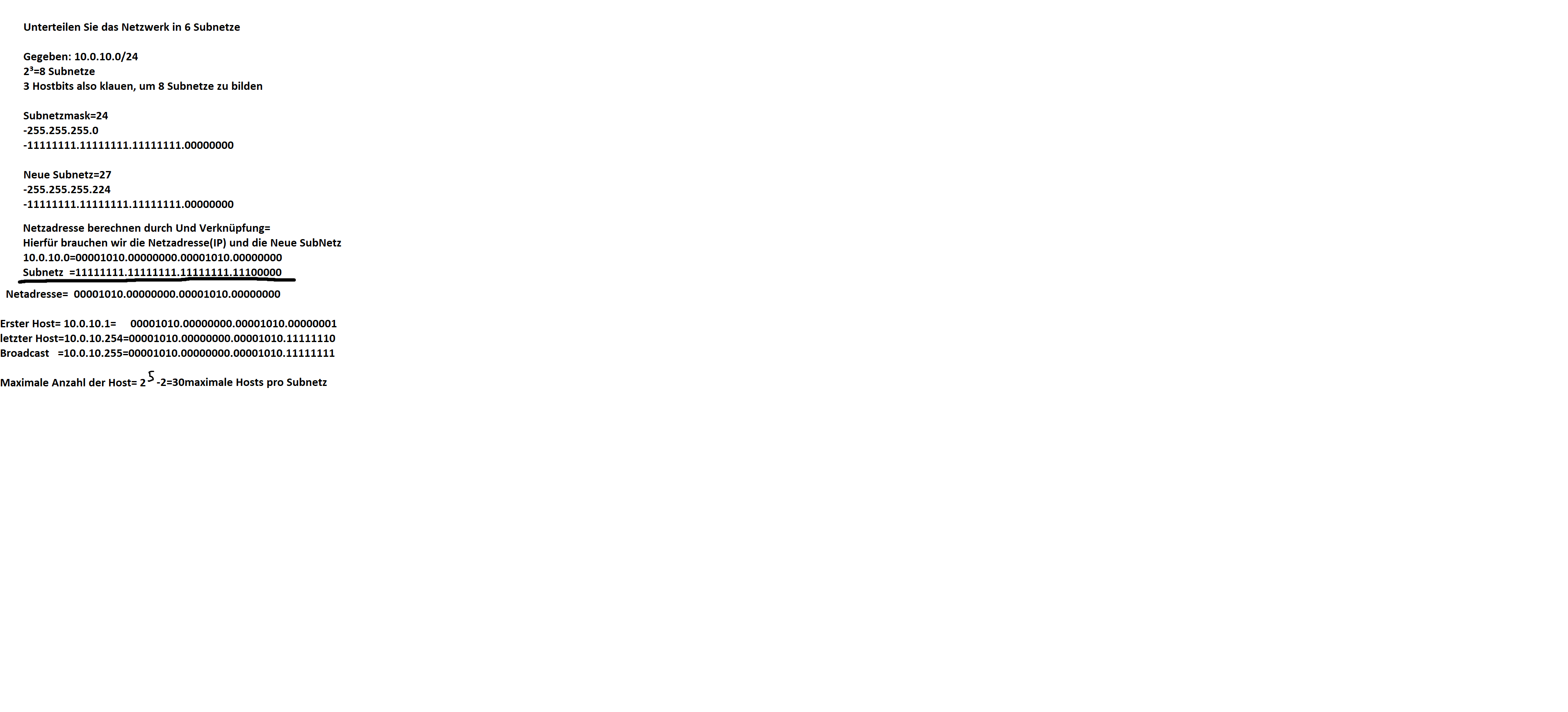 "mindestens" ist durchaus wichtig. man könnte auch genau 6 subnetze verlangen: 4x /27 + 2x /26 (wenn der gesamte bereich des ursprünglichen /24 bereichs genutzt werden soll).Jawad1231 schrieb:Unterteile das Netzwerk in mindestens 6 Subnetze