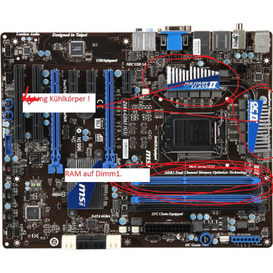 Ich hab links und oben vom CPU Diese 3,8cm hohen lästigen Kühlkörper aufm Board-.- und Rechts ist der 5 cm hohe Ram . Auf Dimm1 .