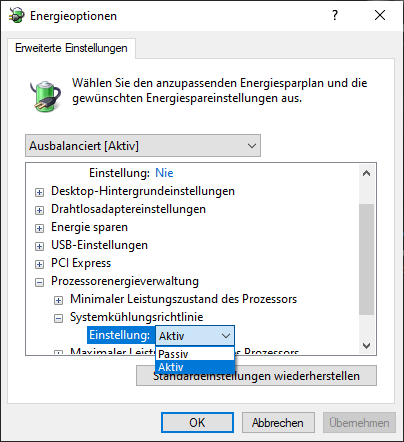 • Die Einstellung Aktiv erhöht die Lüftergeschwindigkeit, bevor der Prozessor auf Hauptkühlung umschaltet. Legen Sie für eine optimale Leistung die Systemkühlungsrichtlinie auf Aktiv fest.