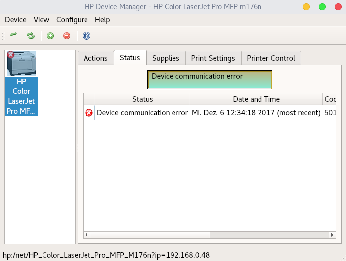 Ich verwende einen HP Color LaserJet Pro MFP m176n, dieser Drucker funktioniert unter Linux (Manjaro) problemlos. Es ist egal, ob du über das Netzwerk oder per USB Daten an den Drucker schickst. Des Weiteren kann auch unter Linux die Scanfunktion über das Netzwerk verwendet werden (z.B. XSane) und HP bietet für Linux einen HP Gerätemanager (siehe Bild - Drucker offline, da ich derzeit nicht im Heimnetzwerk bin).