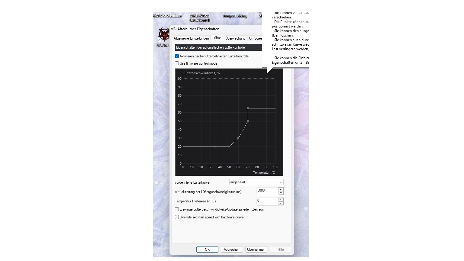 Das mit der Lüfterkurve bekomme ich nicht ganz auf die Reihe. Bei der CPU hab ich es hinbekommen, über den Afterburner wills nicht hinhauen, der dreht trotzdem bis 1600 auf. So 1400 oder so, das würde mir genügen, dann wäre er bei 75 Grad vielleicht, so ist er immer bei 69- 71 im Furmark.