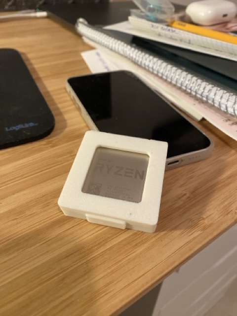 Unabhängig gibt es noch einen Nachtrag von mir. Da ich mich immer noch über meinen Prozessor freue, will ich euch nicht vorenthalten, wie er bei mir ankam. Der Verkäufer hatte die kleine Plastikhülle verlegt und deshalb diese Box in seinem 3D-Drucker gebastelt. Der Prozessor passt auf den Millimeter genau hinein. Ich bin immer noch beeindruckt über so viel Liebe zum Detail. Die Box bekommt von mir einen Ehrenplatz. Ich finde das großartig, wenn sich jemand solch eine Mühe macht. Ich habe ihm das auch geschrieben und mich ehrlichen Herzens bedankt!!!!! Und deshalb poste ich hier auch diese Bilder, noch ist nicht überall Hopfen und Malz verloren!