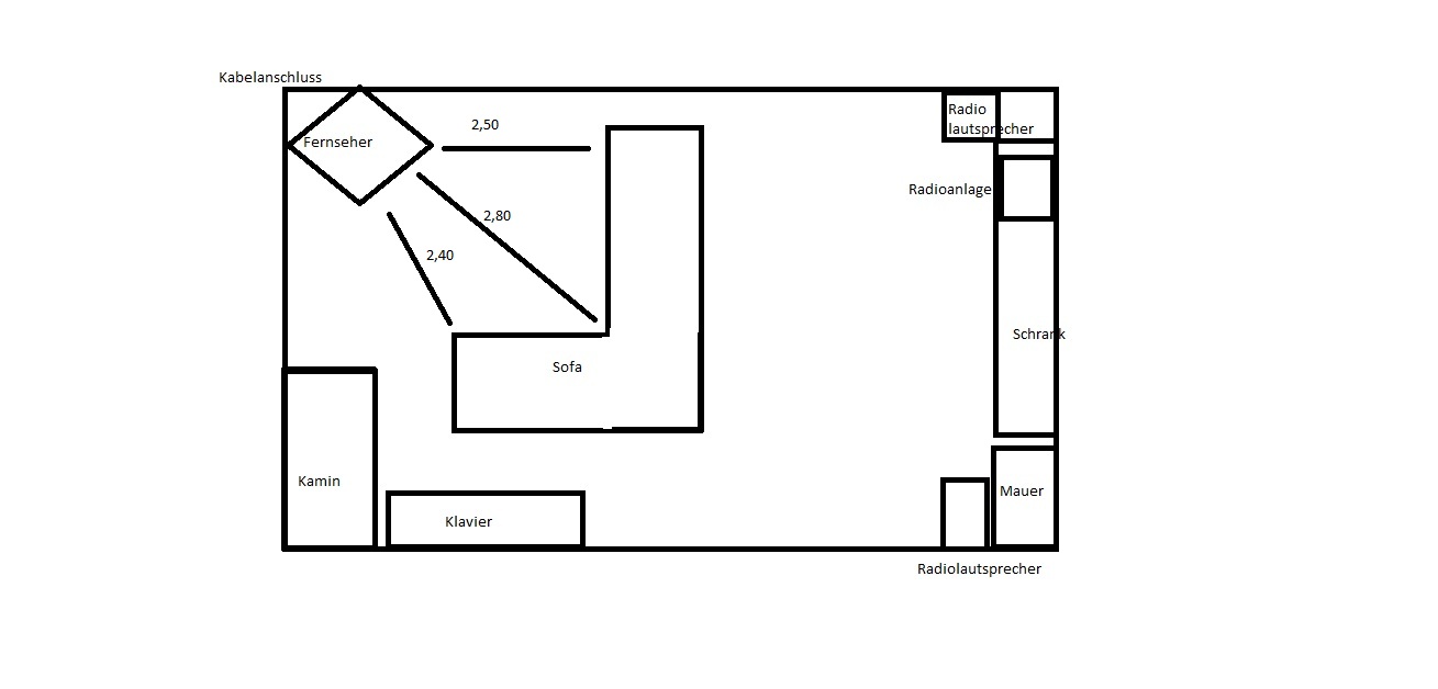 Ich habe eine Skizze von unserem Wohnzimmer angehängt. Wir hätten gerne dazu gerne möglichst guten Sound und das Radio sollte die gleichen Lautsprecher verwenden wie der Fernseher