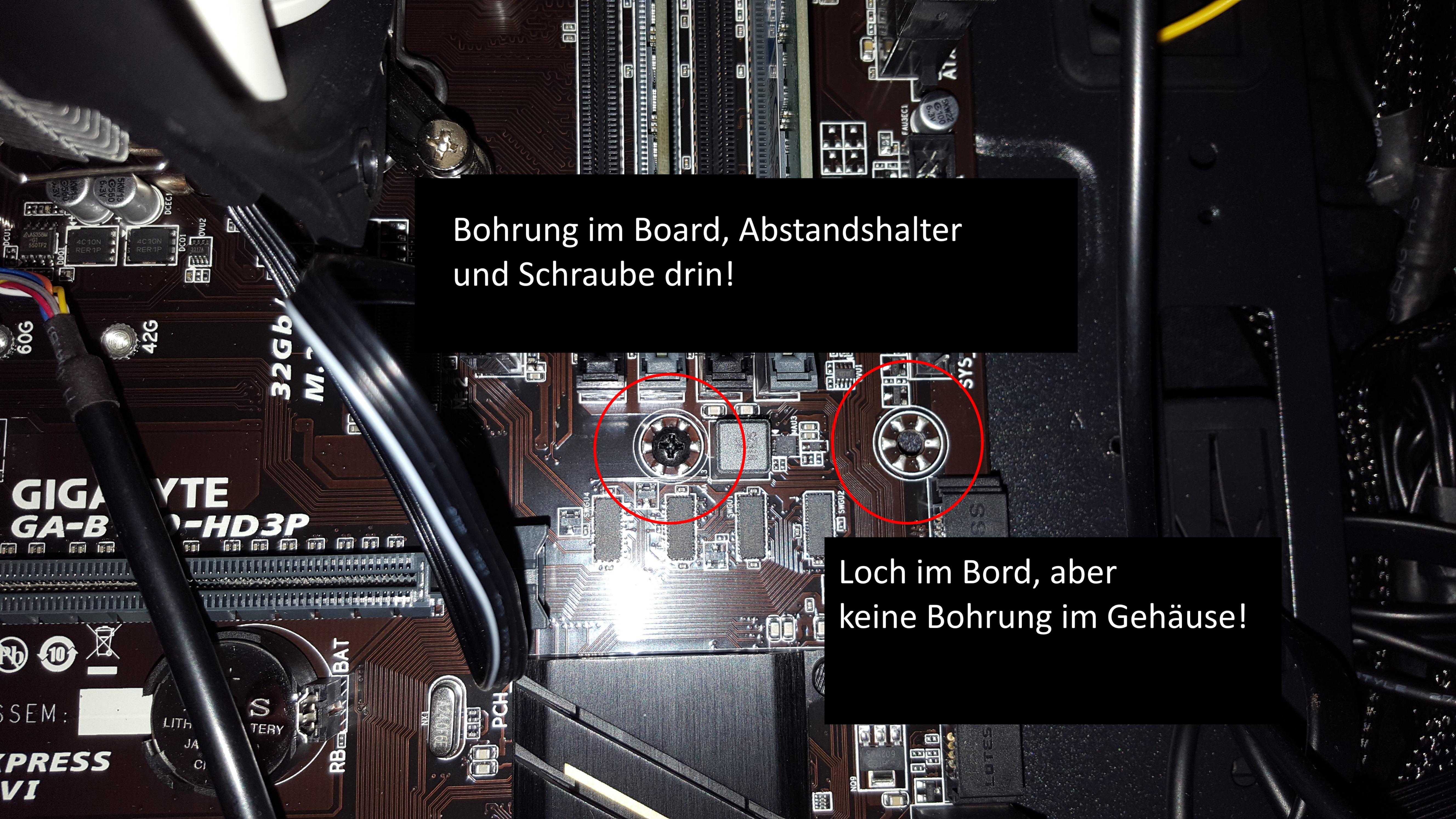 Gucken wo die Löcher im Board sind, nur dort die Abstandshalter montieren. Wenn eine Bohrung im Gehäuse fehlt, den Abstandshalter weg lassen.