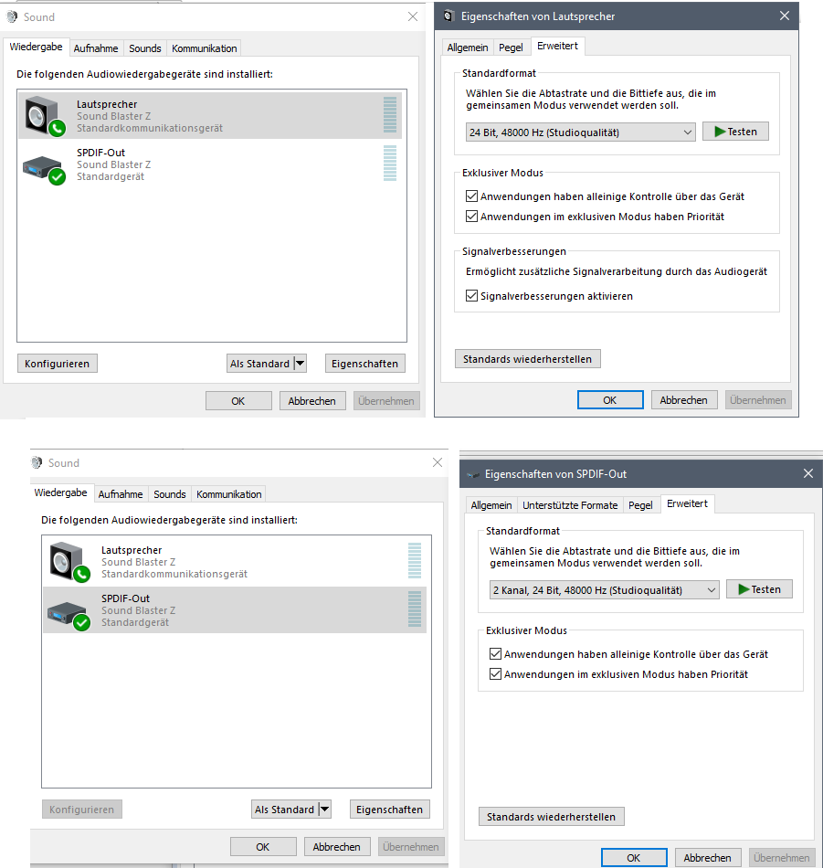Ist es normal, dass bei SPDIF/Out bei den Wiedergabegeräten nur 2 Kanäle auswählbar sind? Höre zwar trotzdem aus allen Boxen was, wenn ich im SBZ-Treiber auf Lautsprecher und 5.1 umstelle, allerdings ist die Mehrkanaloption in Windows nicht verfügbar.