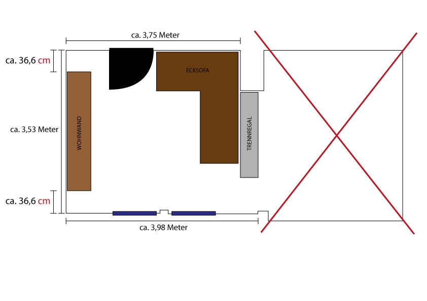 Ich habe eine Grafik von dem Raum gemacht. Dabei ist der hintere Teil (rechts im Bild) nicht zu beachten, dort ist auch eine Dachschräge. Falls ihr mir doch eher eine 2.1 Anlage empfehlen solltet, sollen diese auch rechts und links von der Wohnwand sein.