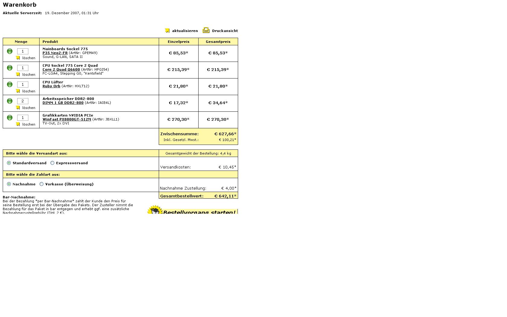 Bis jetzt habe ich den E6850 in Betracht gezogen. Als Speicher würd ich den Corsair Dominator P8500 nehmen und die Seagate Barracuda 320GB Festplatte. Grafikkarte hab ich die GeForce 8800GTS 320MB.