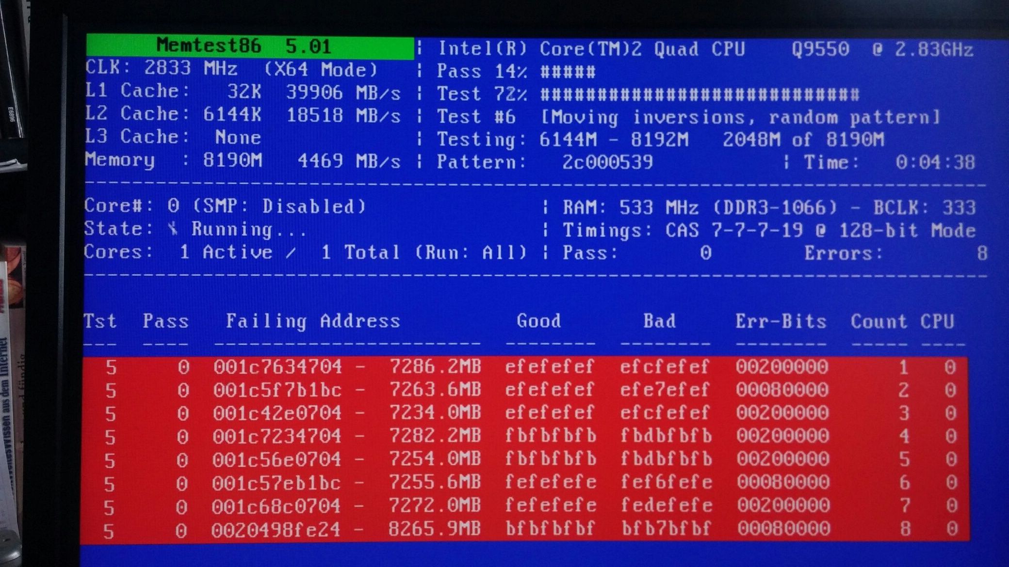 Es kommt alle paar Stunden zu Systemabstürzen (Fehleranzeige: Kernel-Power Ereignis ID-41), und der Memtest86+ zeigt bereits in den ersten Minuten jede Menge Fehler - siehe beilieg. Screenshot.