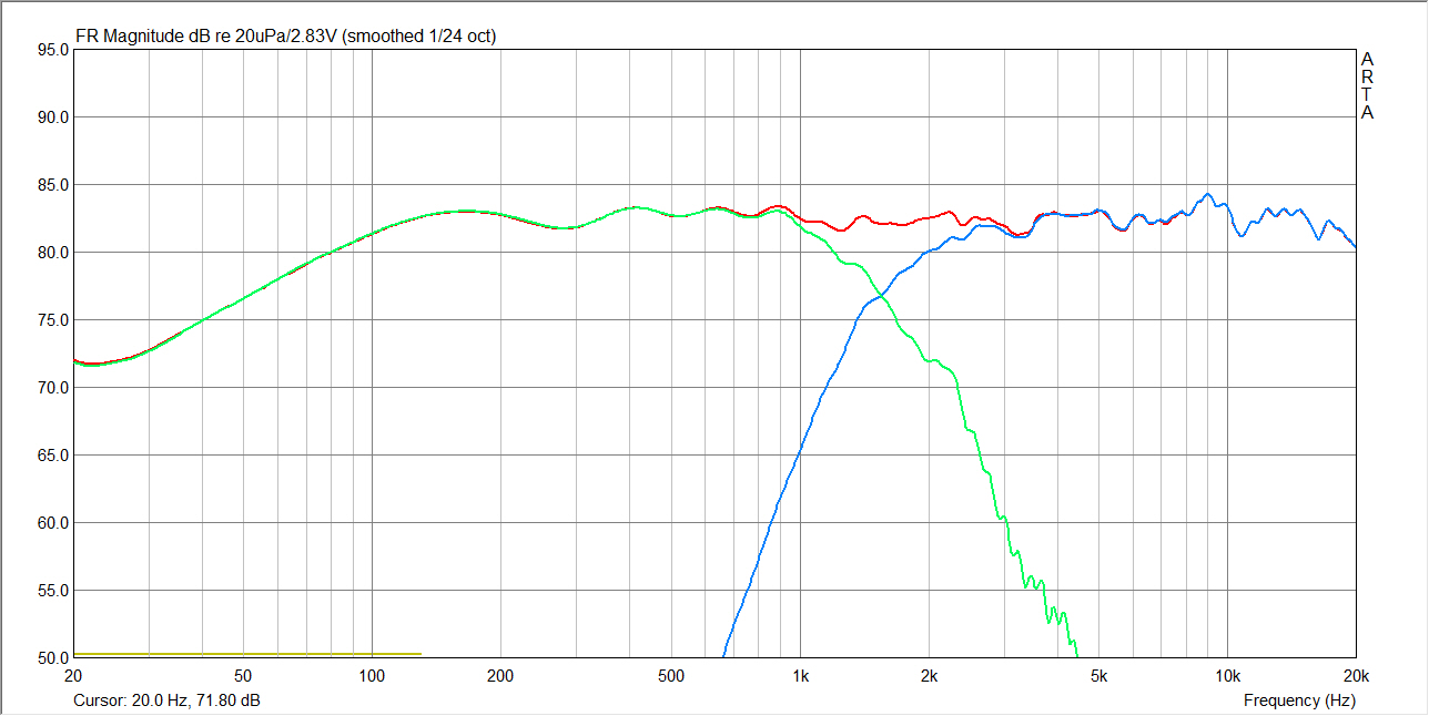 Versuchs-Erklärung akustische Summe: Misst man bei einer 2-Wege Box TMT und HT einzeln, hinterlegt aber im selben Messdiagramm beide Kurven, hat man da auch eine Senke bei / im Bereich der Trennfrequenz beider Chassis. In der Messung steht es auch (!) in Klammern (SAT) wegen Winkel und so. Da wo sich die schwarze und rote Linie kreuzen, ergibt sich eine Addition der Schallwellen, genau diese ist im Diagramm aber nicht hinterlegt.