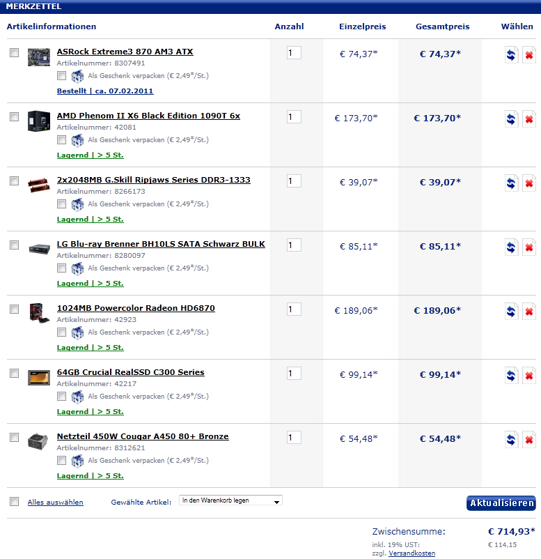 Ich hätte gerne noch einen BlueRay-Brenner und auch ein Gehäuse habe ich mir bereits ausgesucht. Das Gehäuse kostet 150€, daher bleiben für Netzteil, CPU, Mainboard, RAM, Grafikkarte und BlueRay-Brenner und SSD noch 850€ Rest.